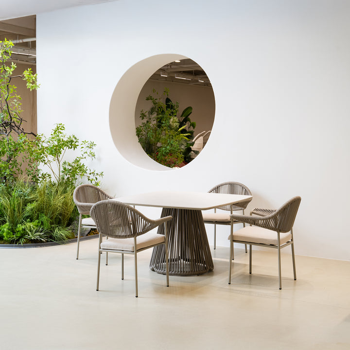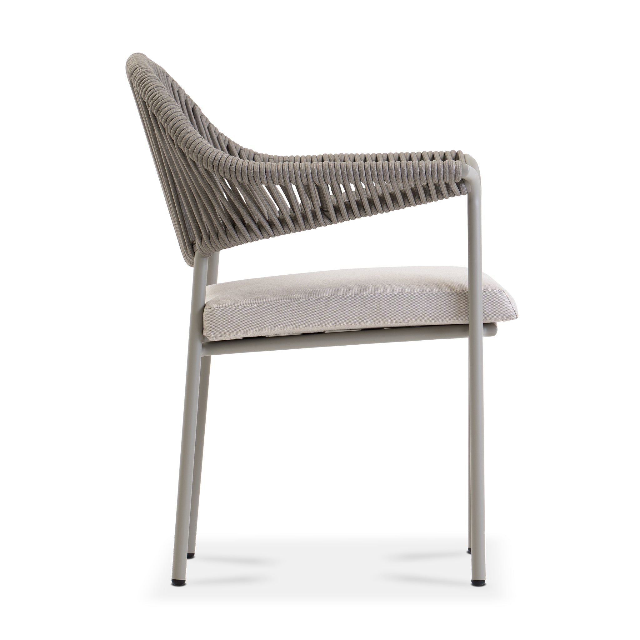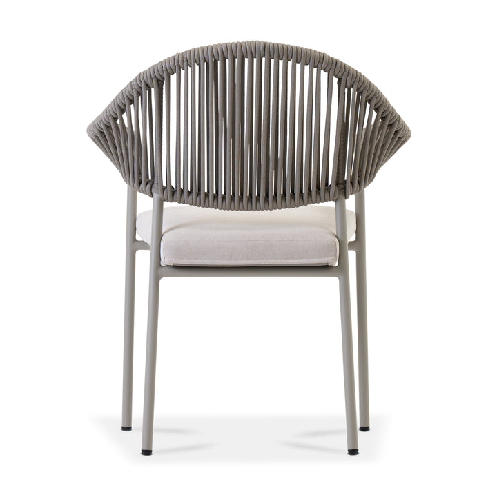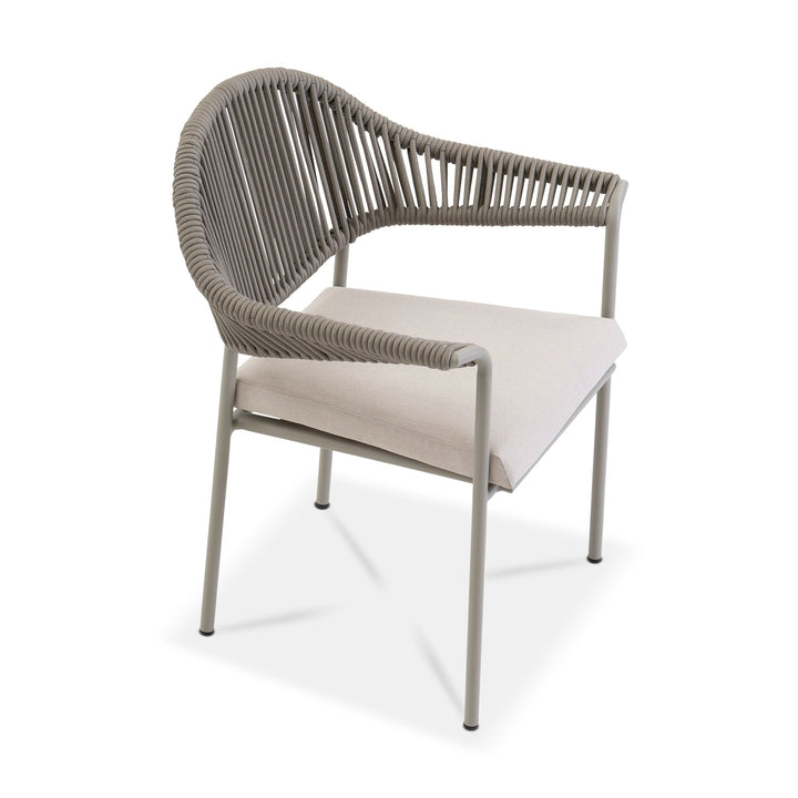 This outdoor dining chair pairs a minimalist powder-coated aluminum frame with a gently curved back wrapped in handwoven rope. A quick-dry foam cushion in latte fabric offers soft, all-weather comfort. Clean lines and subtle texture make it a versatile piece for modern dining spaces. It completes the look when styled with the embrace dining table for a cohesive outdoor setting.