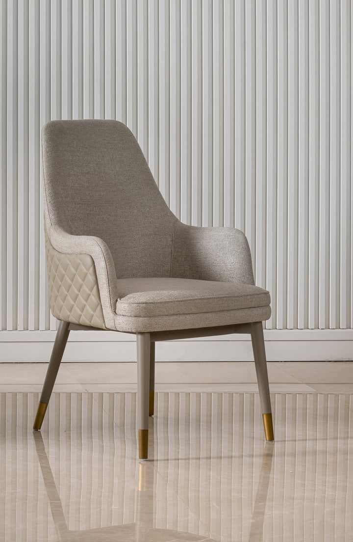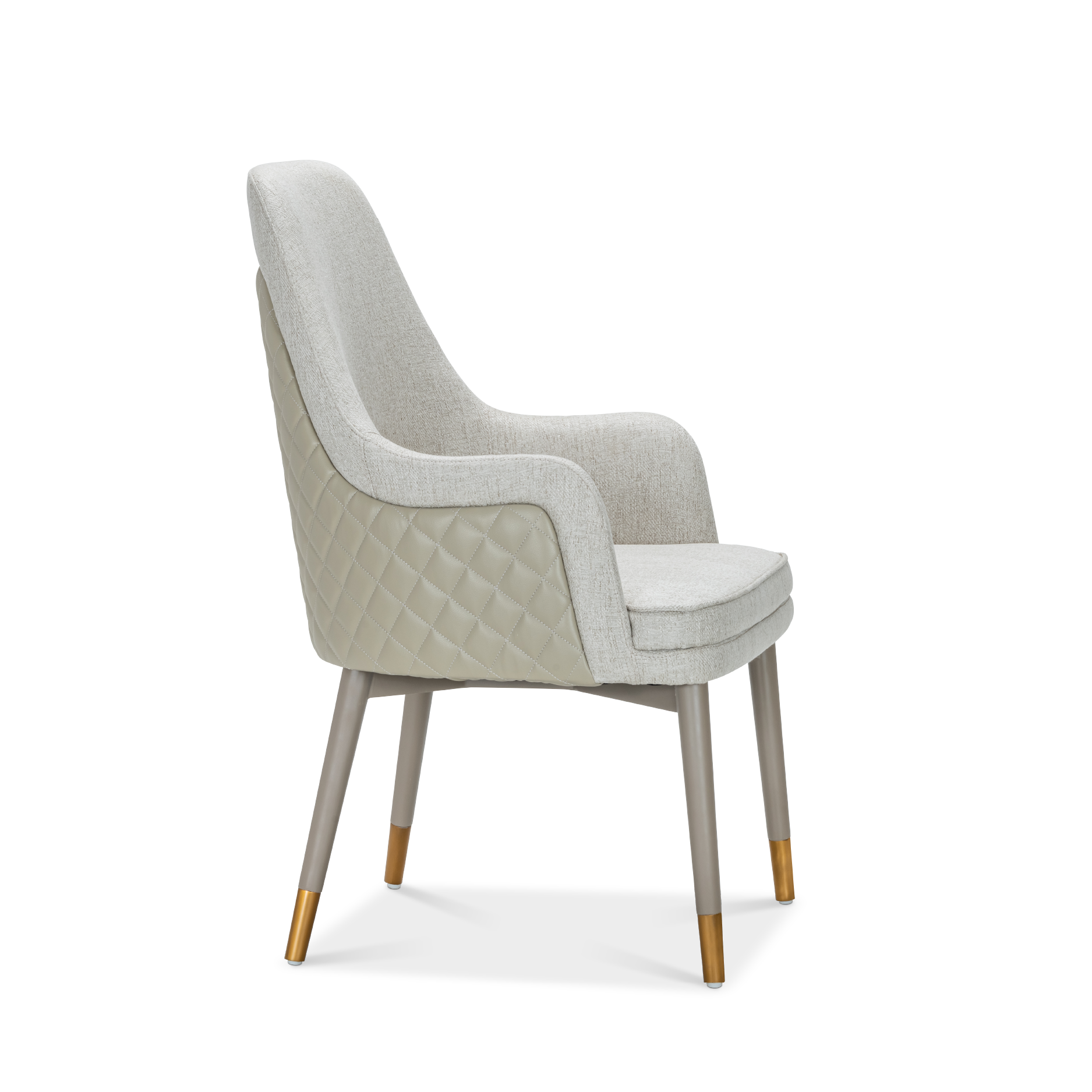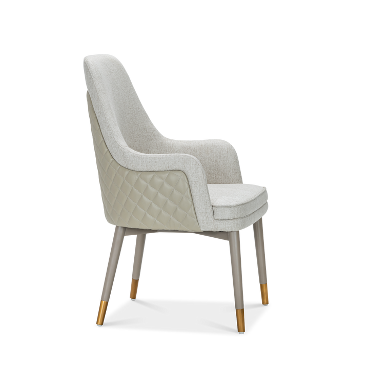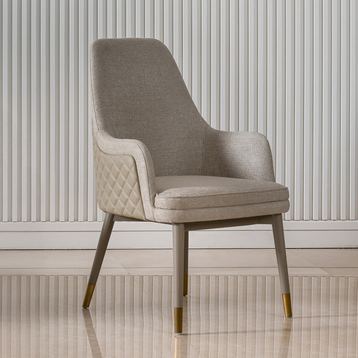 Upholstered in light beige chenille on the seating and the outer back stands out in dark beige faux leather, detailed with diamond quilting, greige legs with stainless steel metal ferrules in an electroplated brushed brass finish for a refined touch.