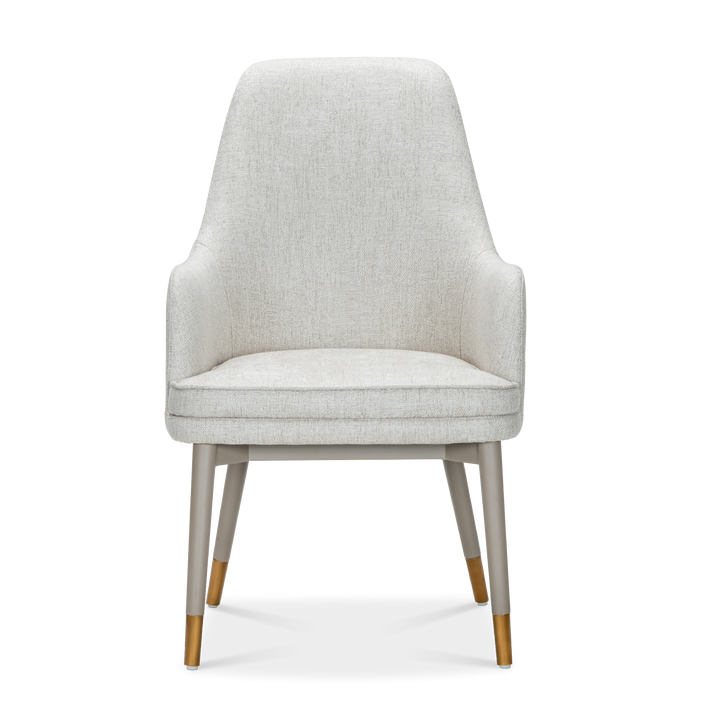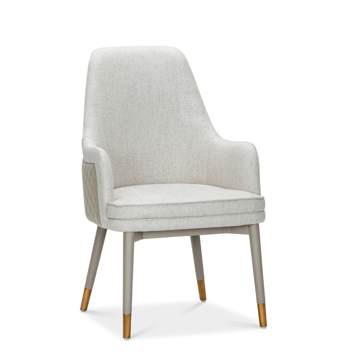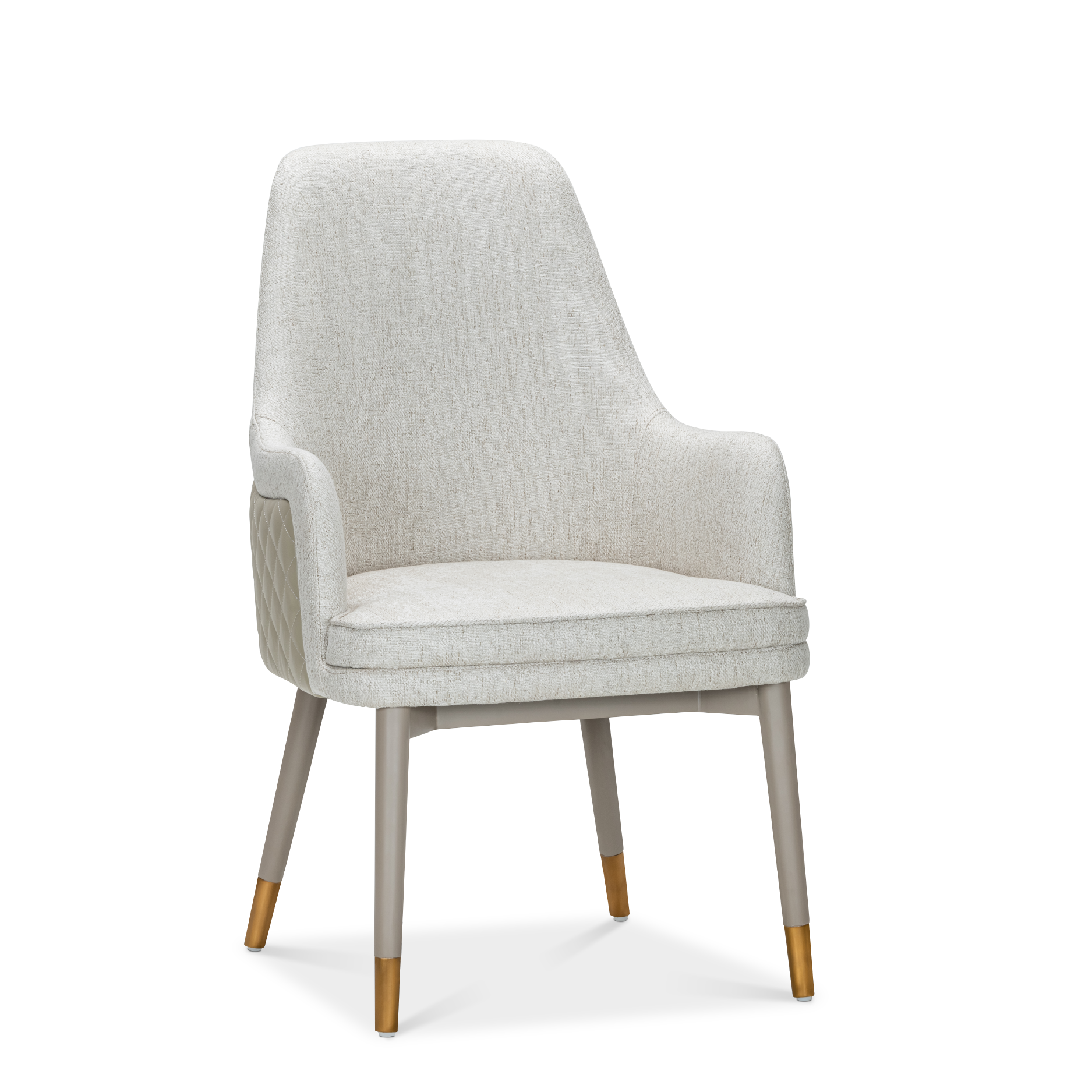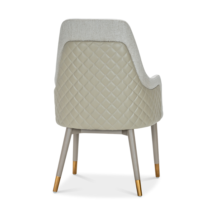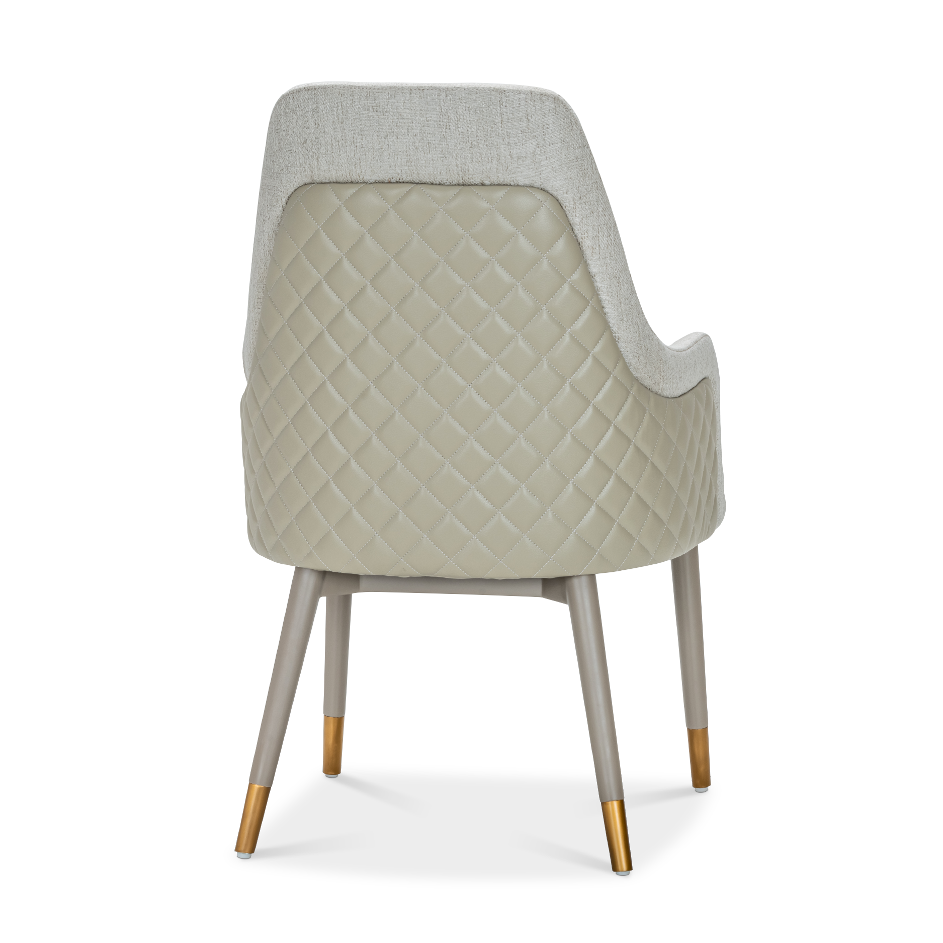 Upholstered in light beige chenille on the seating and the outer back stands out in dark beige faux leather, detailed with diamond quilting, greige legs with stainless steel metal ferrules in an electroplated brushed brass finish for a refined touch.