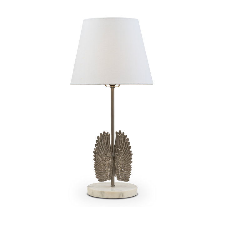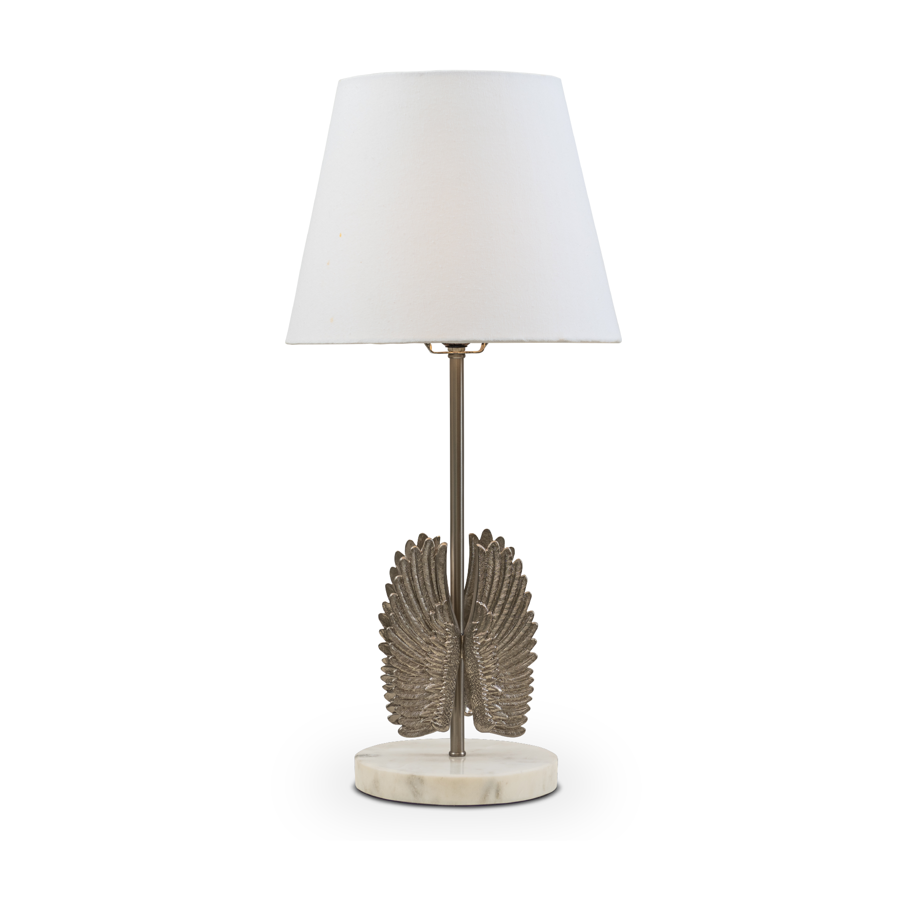 This table lamp has a clean, elegant look with a white shade and round marble base. A decorative feather-shaped detail adds a special touch to the design. Perfect for placing on bedside tables, desks, or living room consoles.