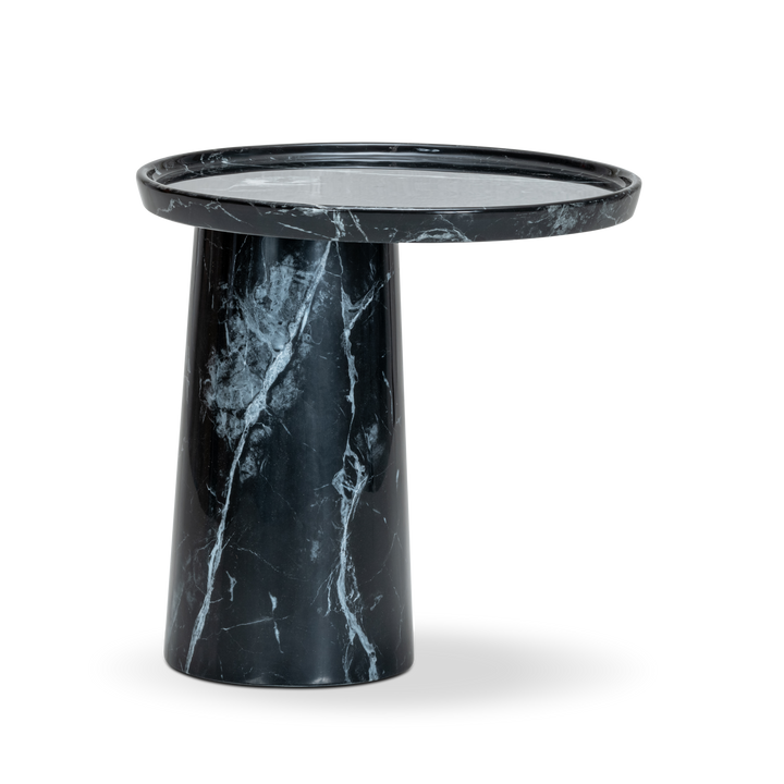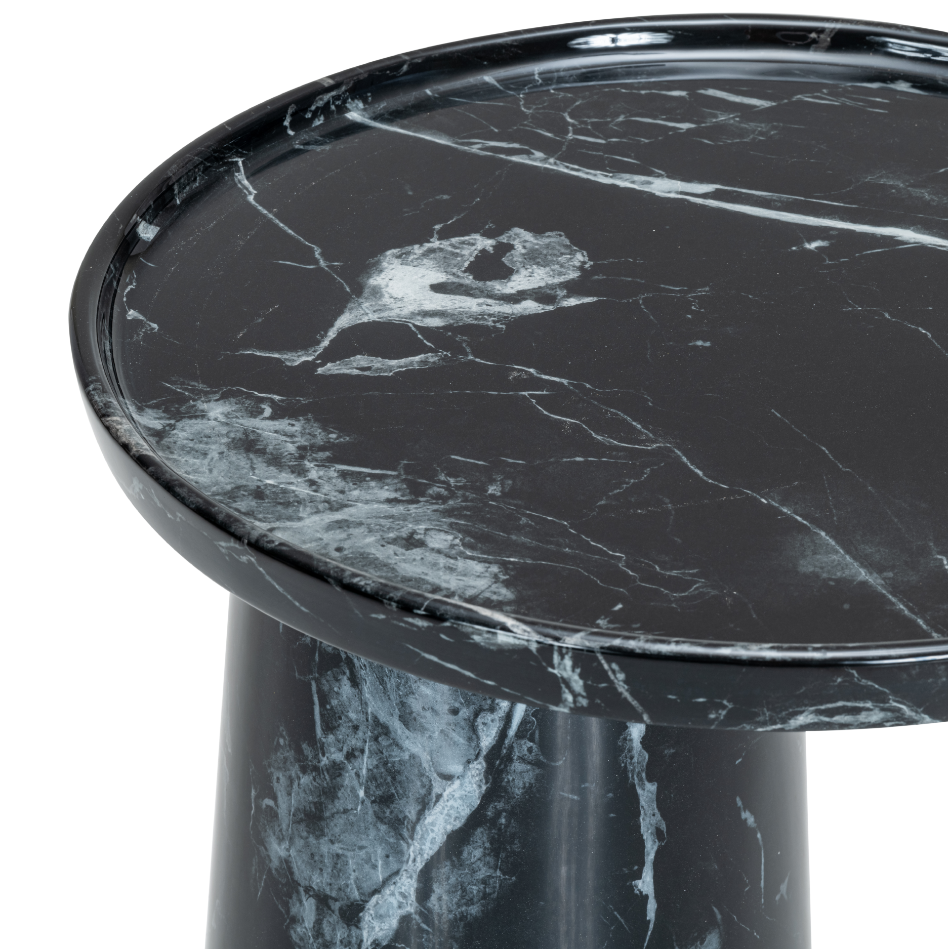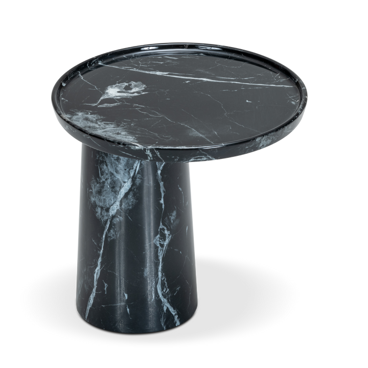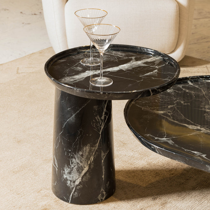 An ideal pairing with the flamara coffee Table, the top features a natural black marble finish, offering an elegant surface. The base is crafted from stainless steel and laminated in faux black marble for a seamless and cohesive appearance.