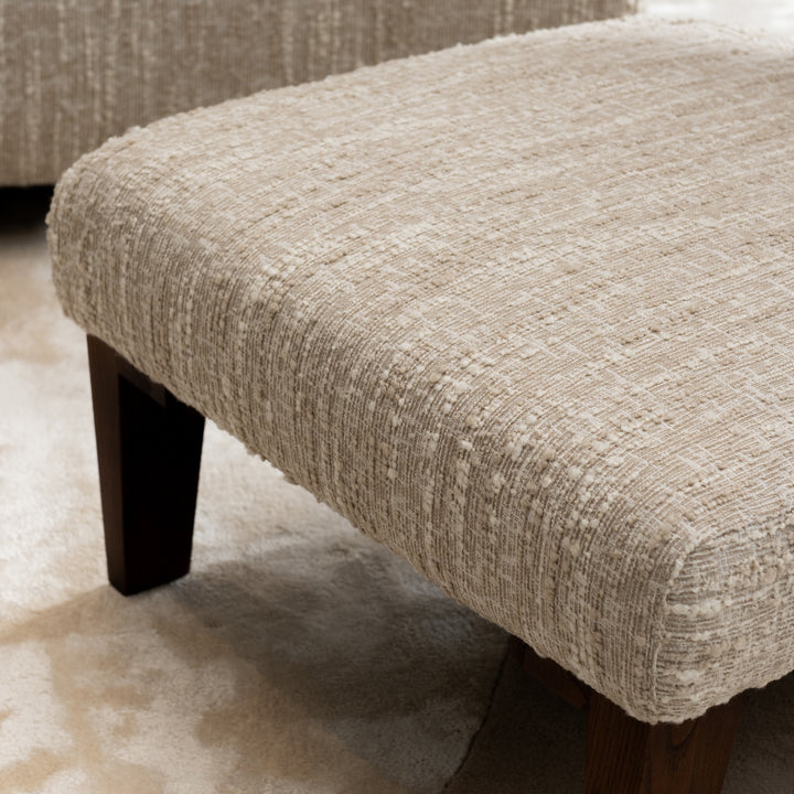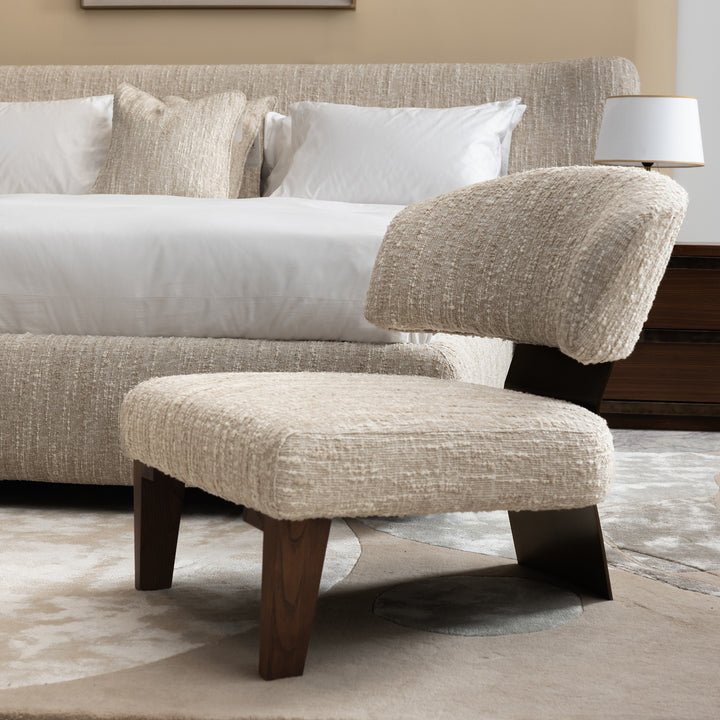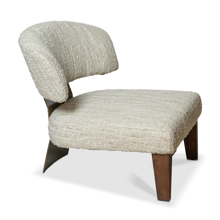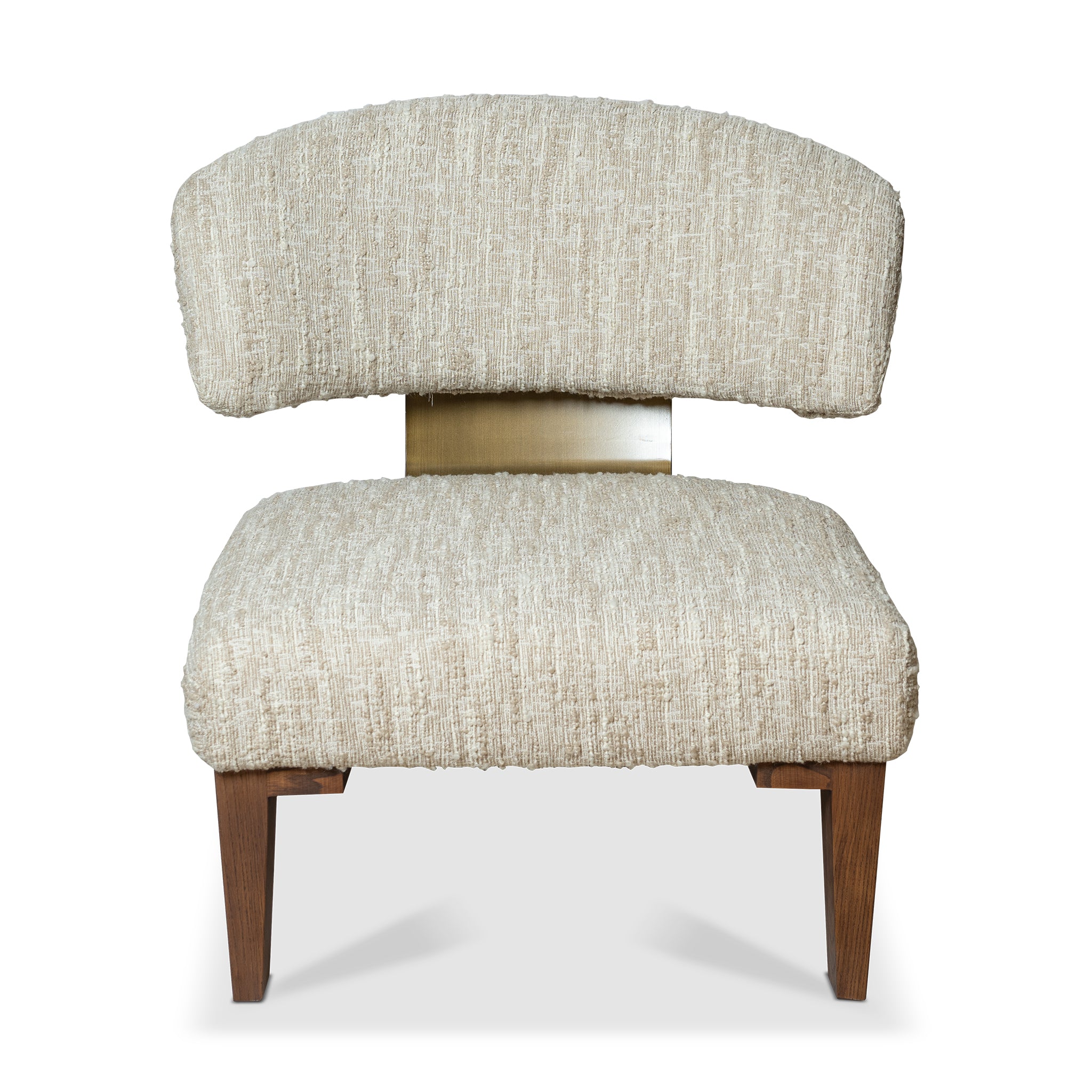 Designed with a refined balance of comfort and elegance, this piece pairs timeless materials with thoughtful detailing. Rich walnut legs and a brushed brass stainless steel back support complement the plush boucle upholstery, woven in alternating tones of beige and ivory for added texture.