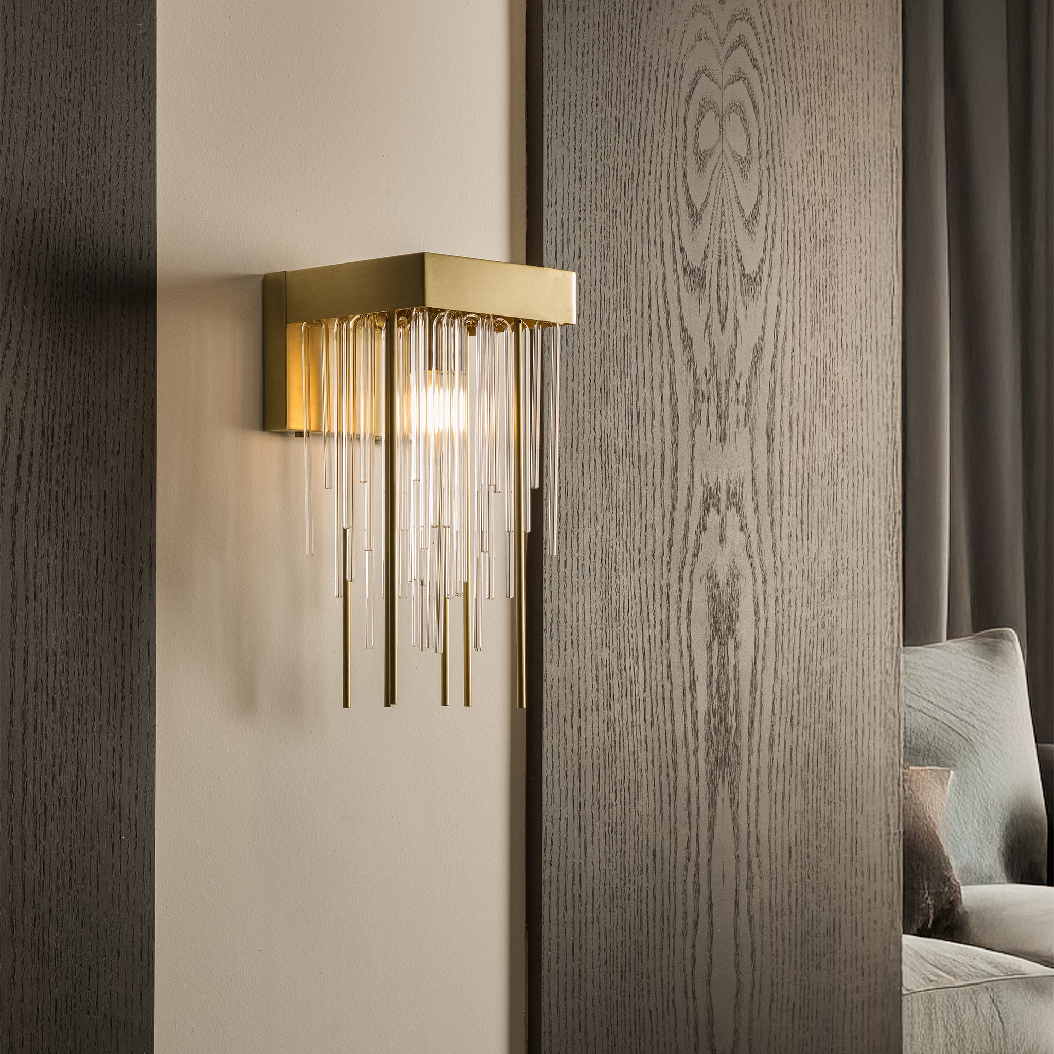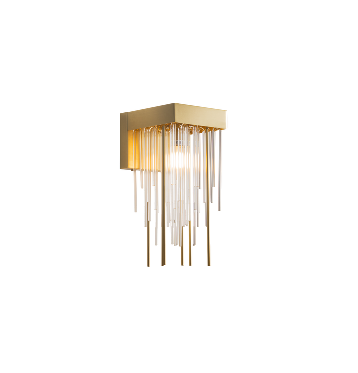 Inspired by the timeless allure of art deco design, this wall lamp features a captivating cascade of clear glass rods suspended from an antique brass frame. Complete the look by pairing it with the sublime collection.