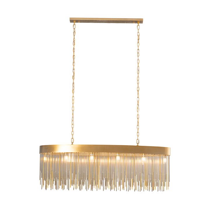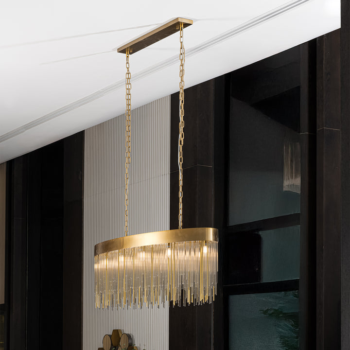 Reflecting the refined geometry of art deco style, this oval chandelier features tiers of clear glass rods suspended from an antique brass frame. Each piece is individually assembled to create a harmonious balance of craftsmanship and design.