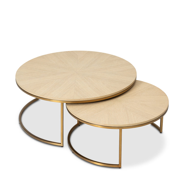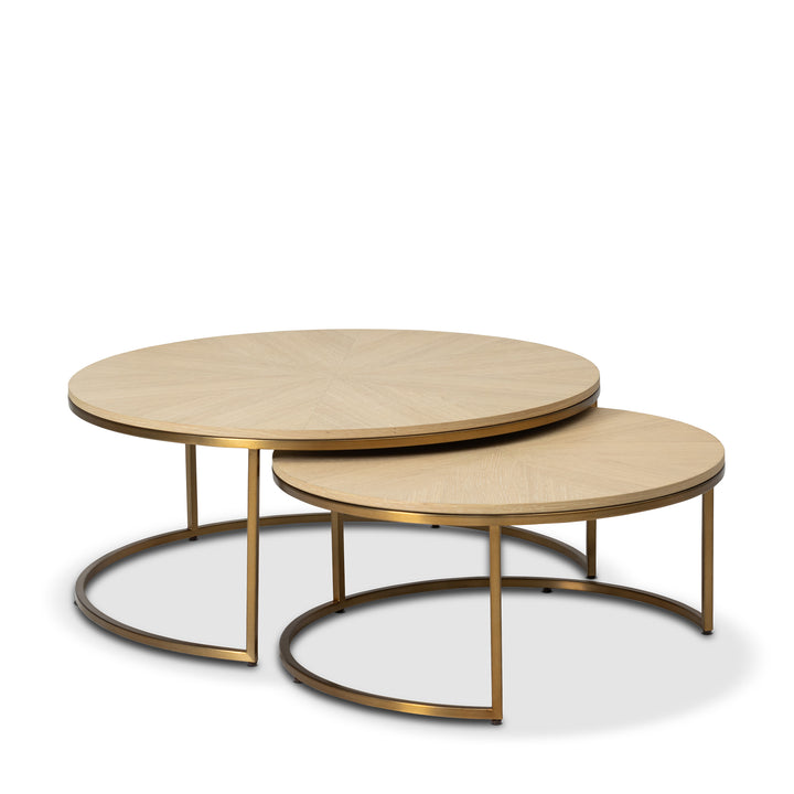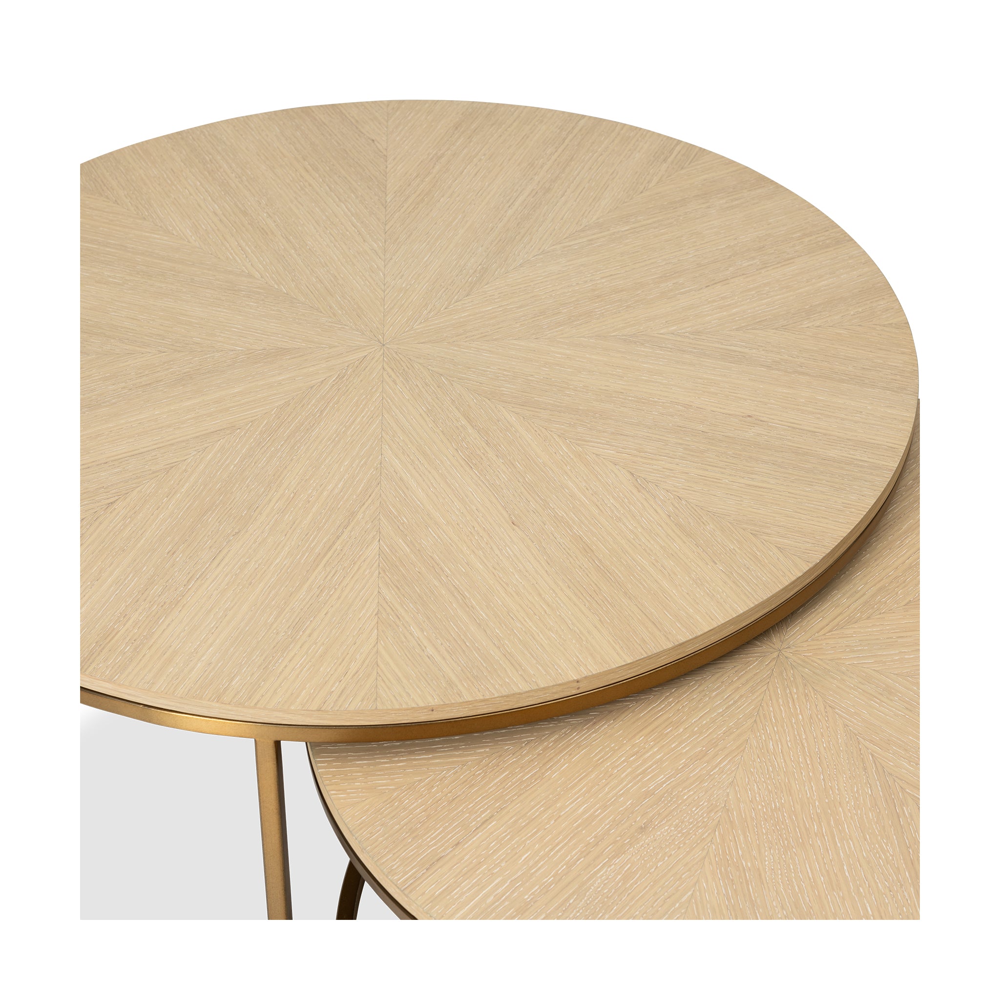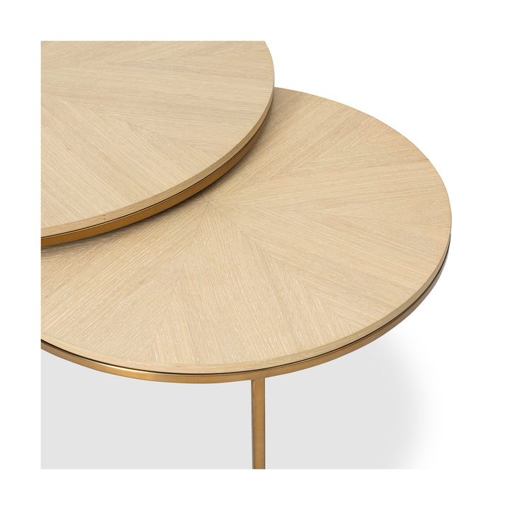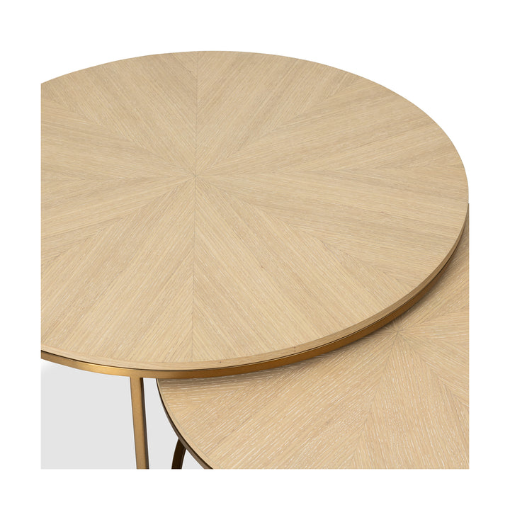 A sunburst marquetry top in hampton oak veneer defines this cocktail table with a refined presence. The round silhouette rests on a brushed antique brass base, blending natural texture with modern sophistication.