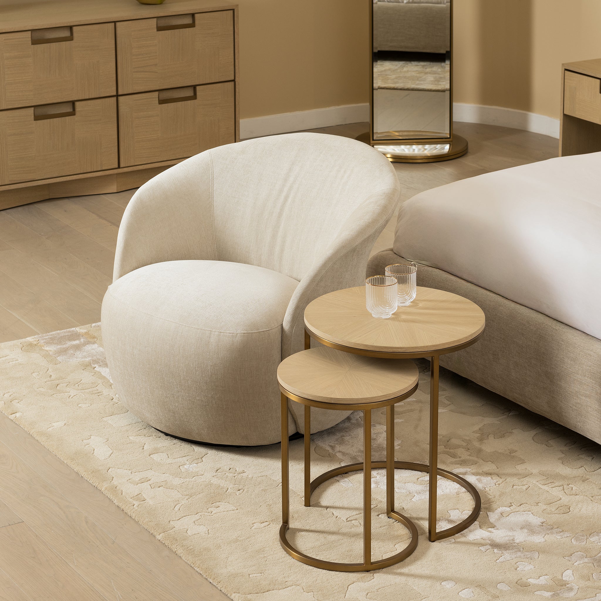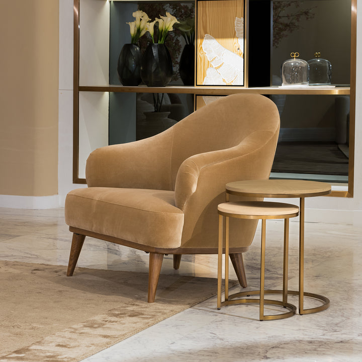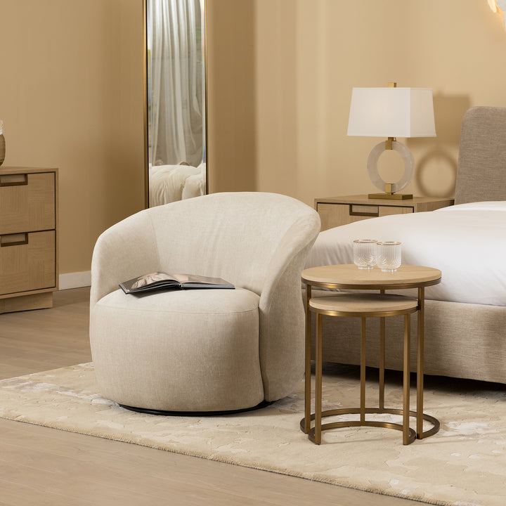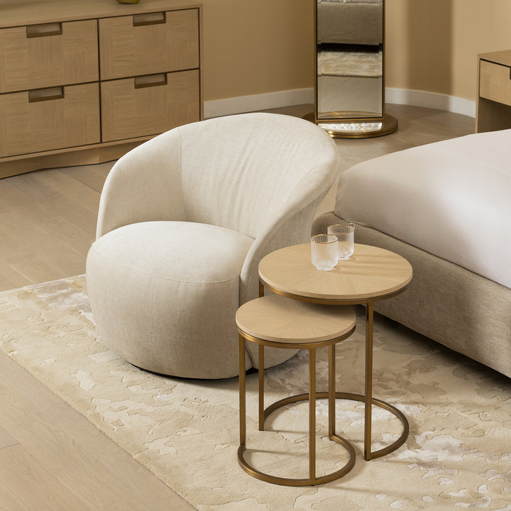 The elegance of hampton oak veneer in a sunburst marquetry pattern gives this end table a refined presence. A brushed antique brass base adds style, elevating its timeless round form. Together with the gallo collection, it completes the space with balance and sophistication.