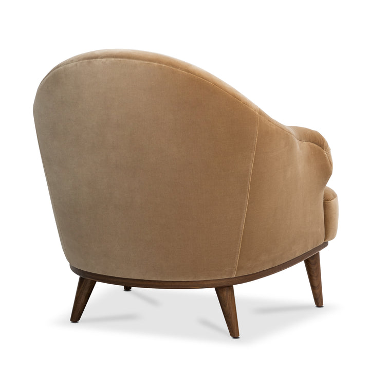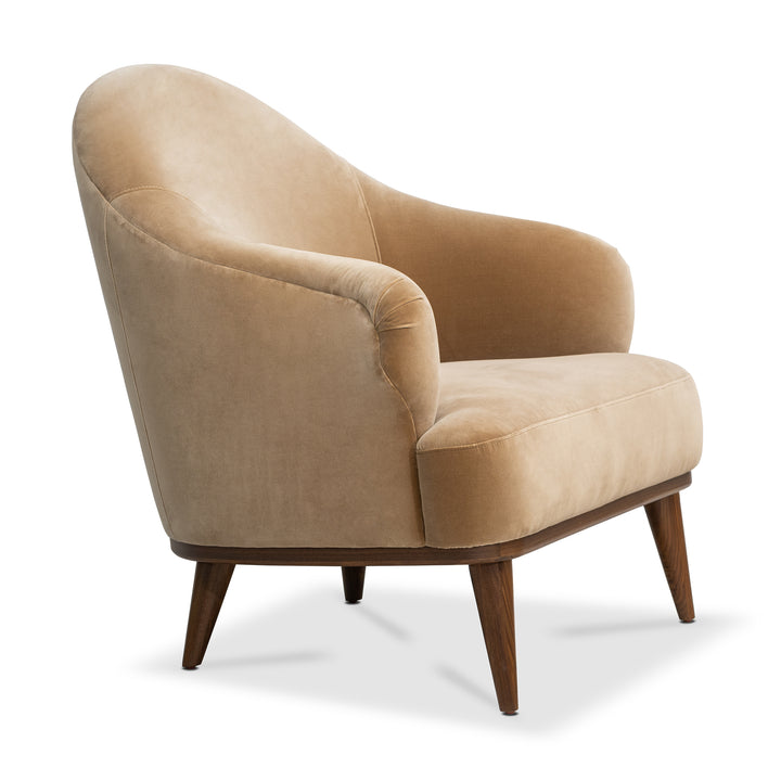 This armchair draws inspiration from the sweeping curves of Art Deco design, softened by the clean lines and understated elegance of mid-century modern style. Upholstered in 100% cotton velvet in briar beige, it rests on solid wood legs and a base in a midtone walnut finish bringing warmth, texture, and tailored sophistication to any space.