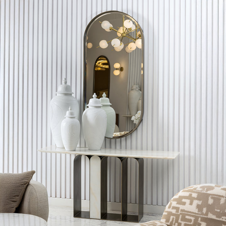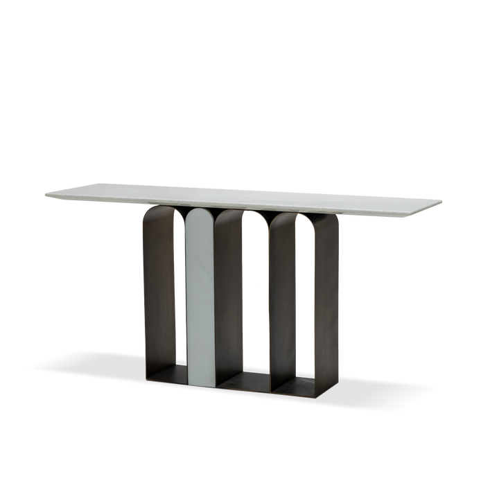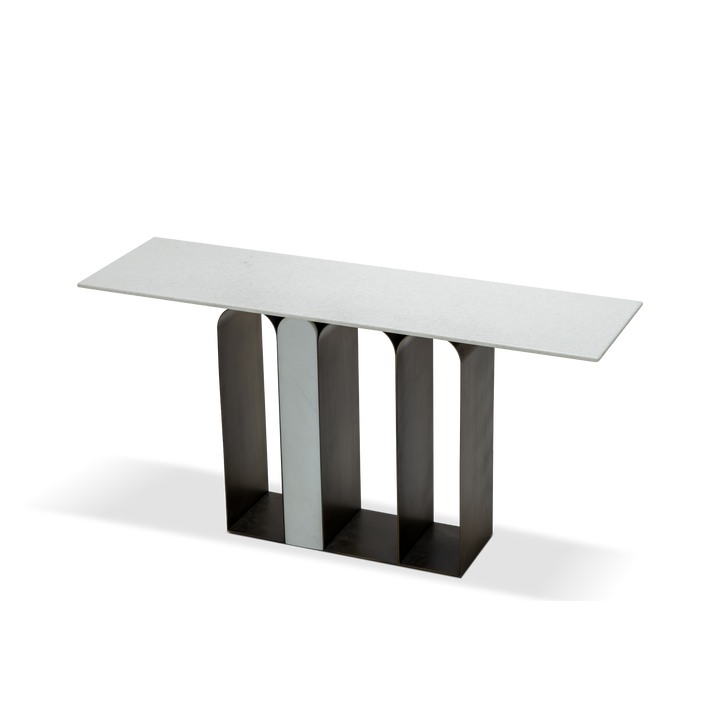 A stylish console features a rectangular natural white marble top supported by sculpted frames in an antique brass finish. A vertically placed marble slab accentuates the structure, while the distinctive veining of the stone makes each piece truly one of a kind.