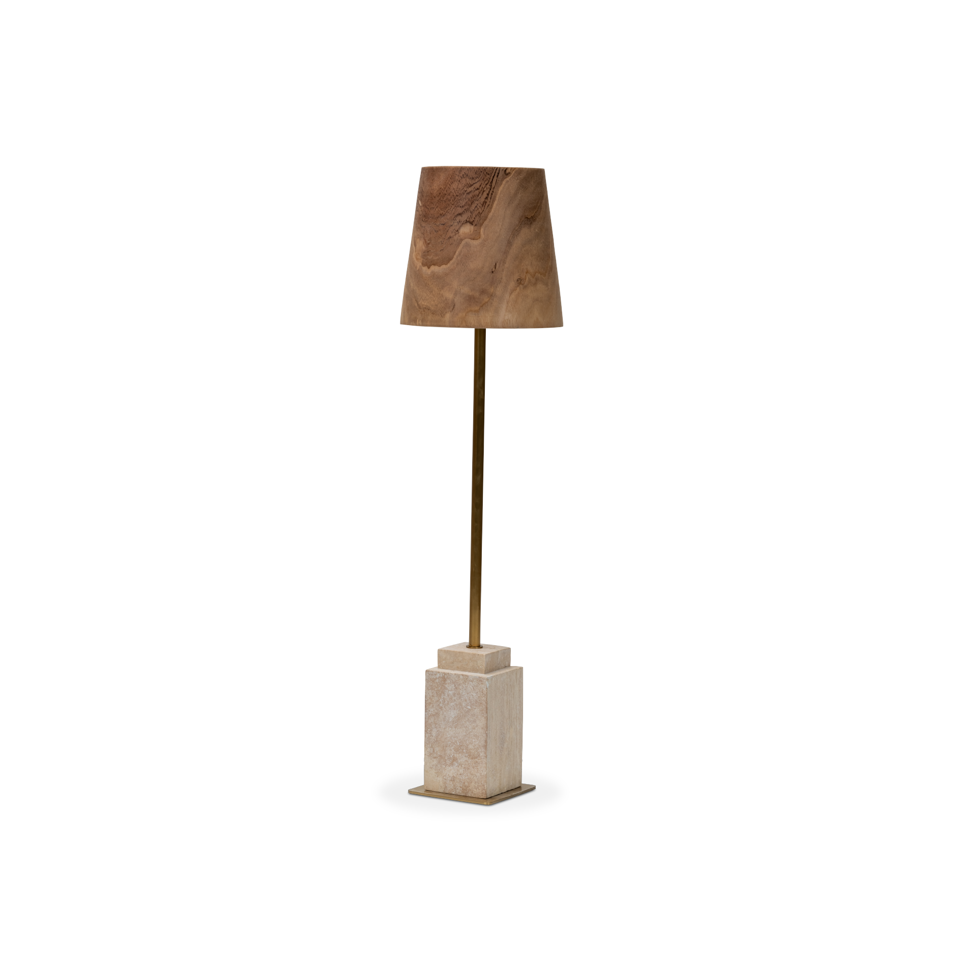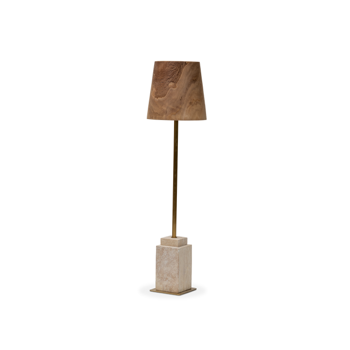 Combining natural elements with sleek design, this table lamp creates a refined balance of materials. The travertine base provides a solid foundation, while the paulownia wood shade showcases delicate veining that enhances its organic beauty.