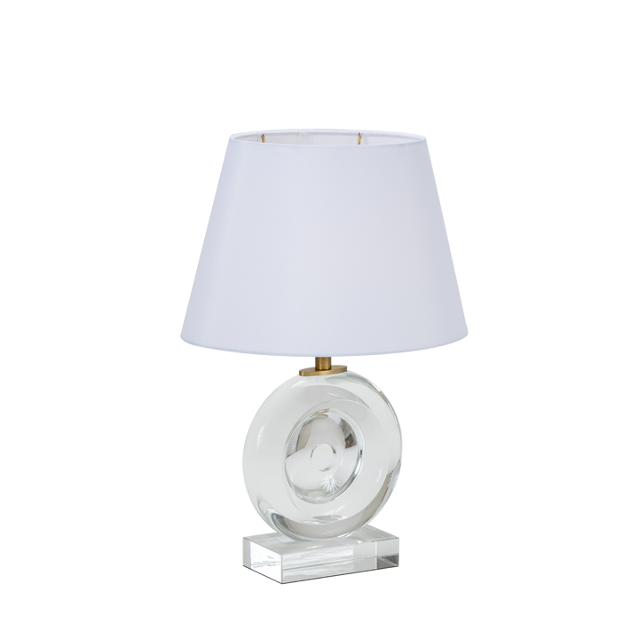 Defined by its sculptural circular form, this table lamp embodies a sense of balance and quiet sophistication. The solid crystal base highlights the silhouette, complemented by stainless steel accents.