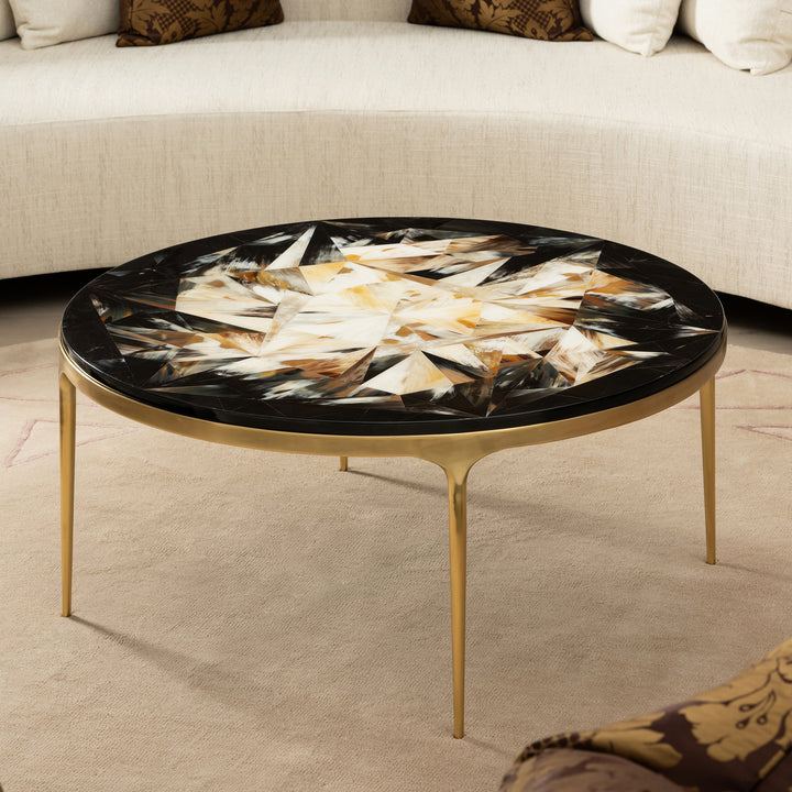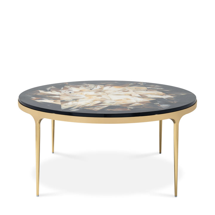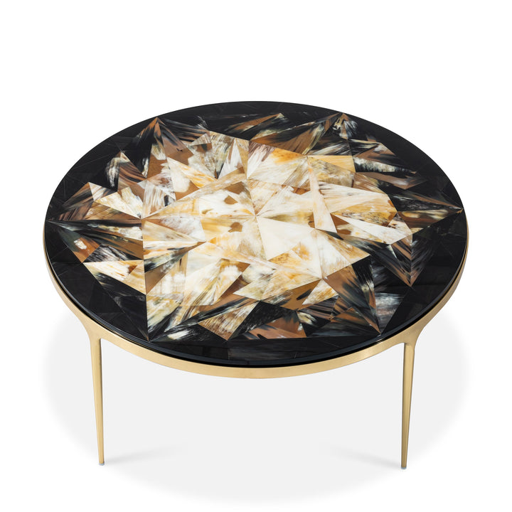 Rooted in art deco design, the coffee table features a horn marquetry top finished in a ten-step high-gloss lacquer finish and a polished brass frame. Pair it with the full skyle collection to elevate your living room.