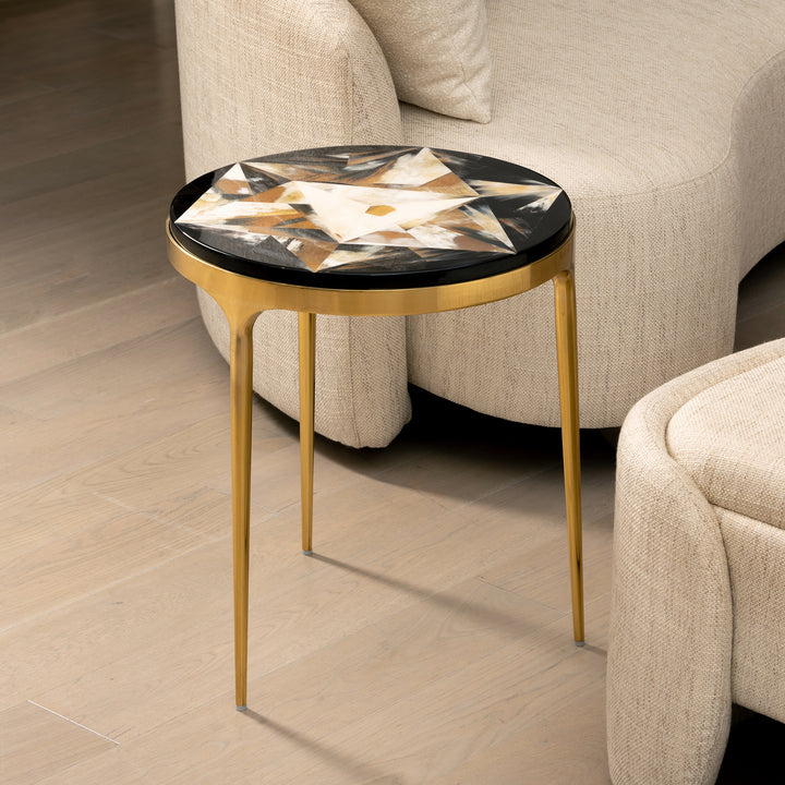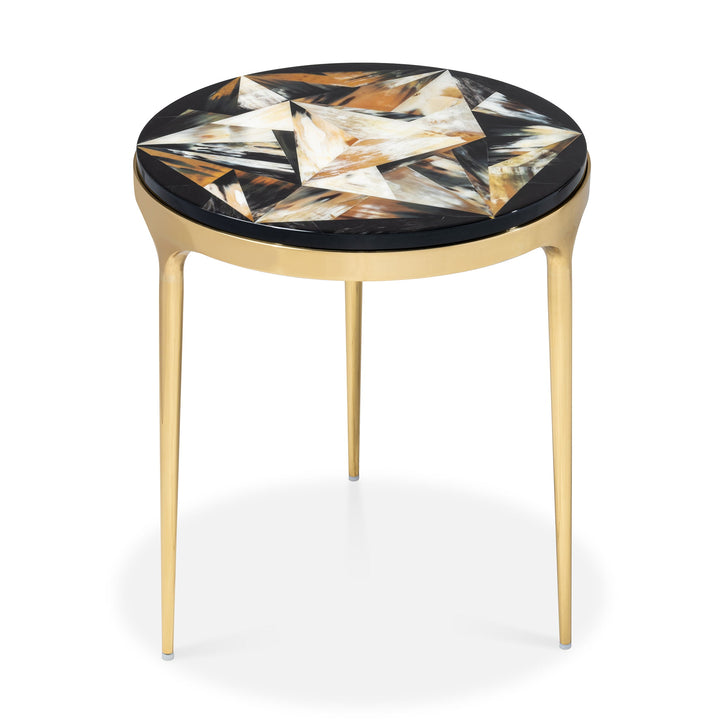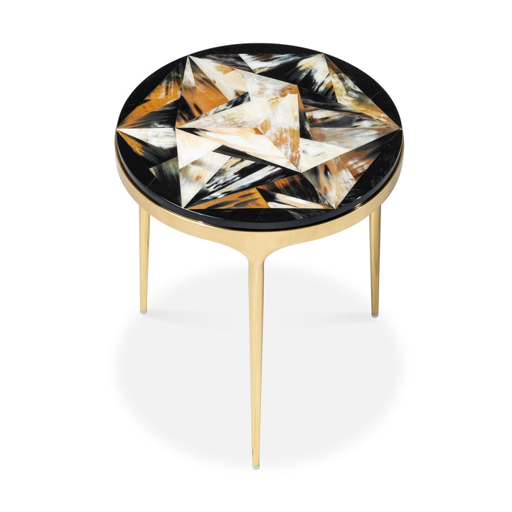 Defined by art deco elegance, the end table features a horn marquetry top with a ten-step high-gloss lacquer and polished brass legs. Complete the look with the skyle collection for a unified statement of style.
