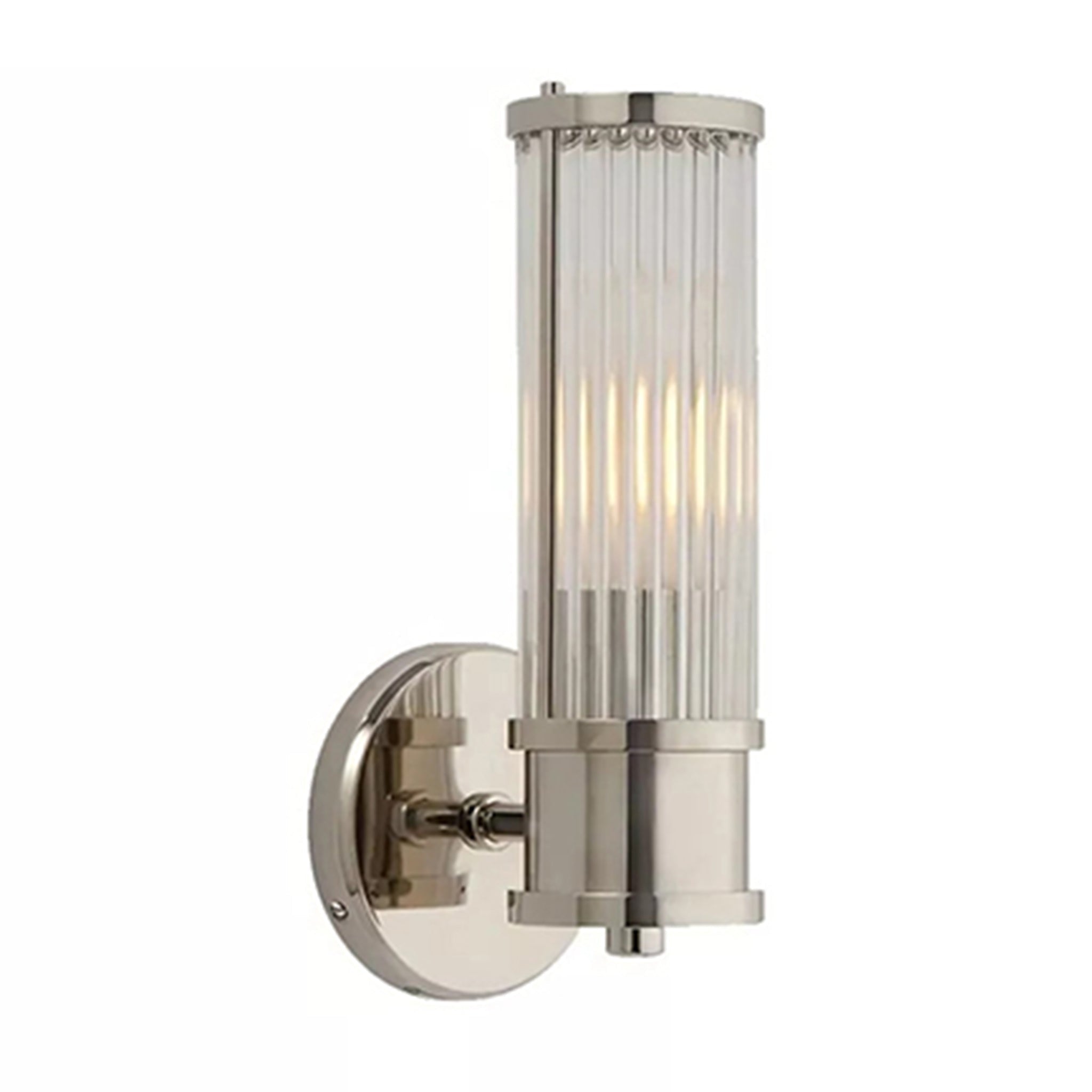 This wall lamp captures the timeless elegance of art deco design through its vertical glass rods and steel frame in a nickel finish. The sleek structure enhances light reflection, creating a sophisticated visual effect.