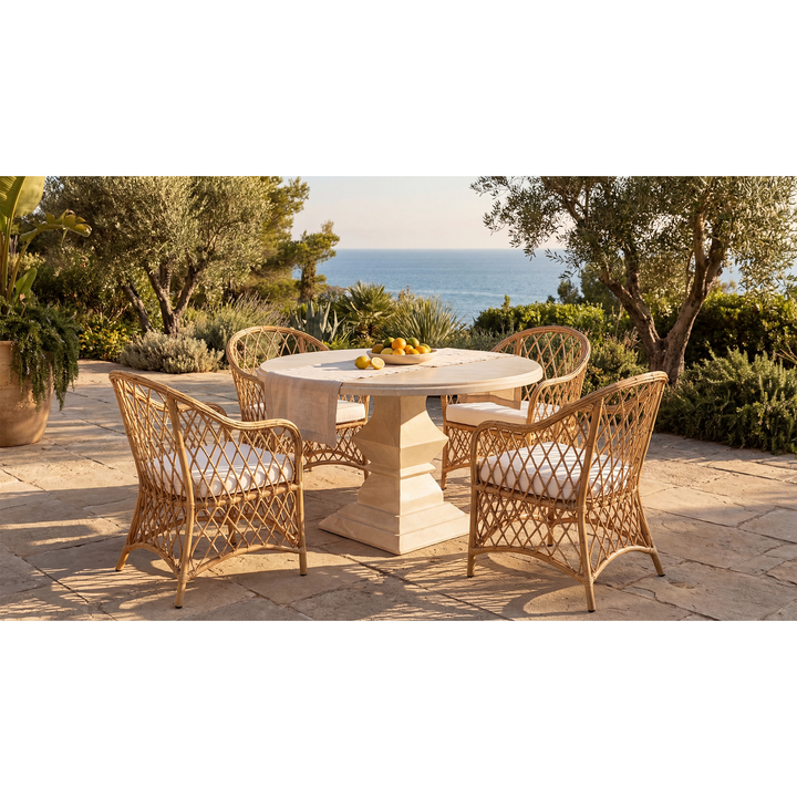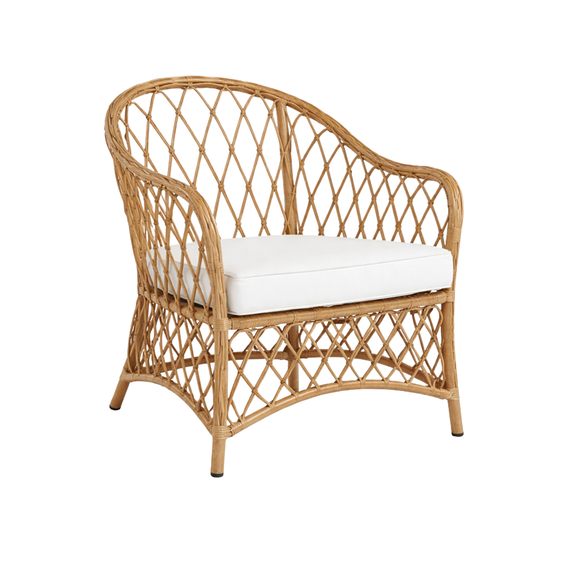 Defined by a sculptural silhouette and an open woven frame, this armchair reflects a relaxed, coastal sensibility. Hand-wrapped wicker traces every curve, creating depth, texture, and visual lightness. Generously cushioned in crisp off-white upholstery, it offers enduring comfort designed for refined outdoor living.