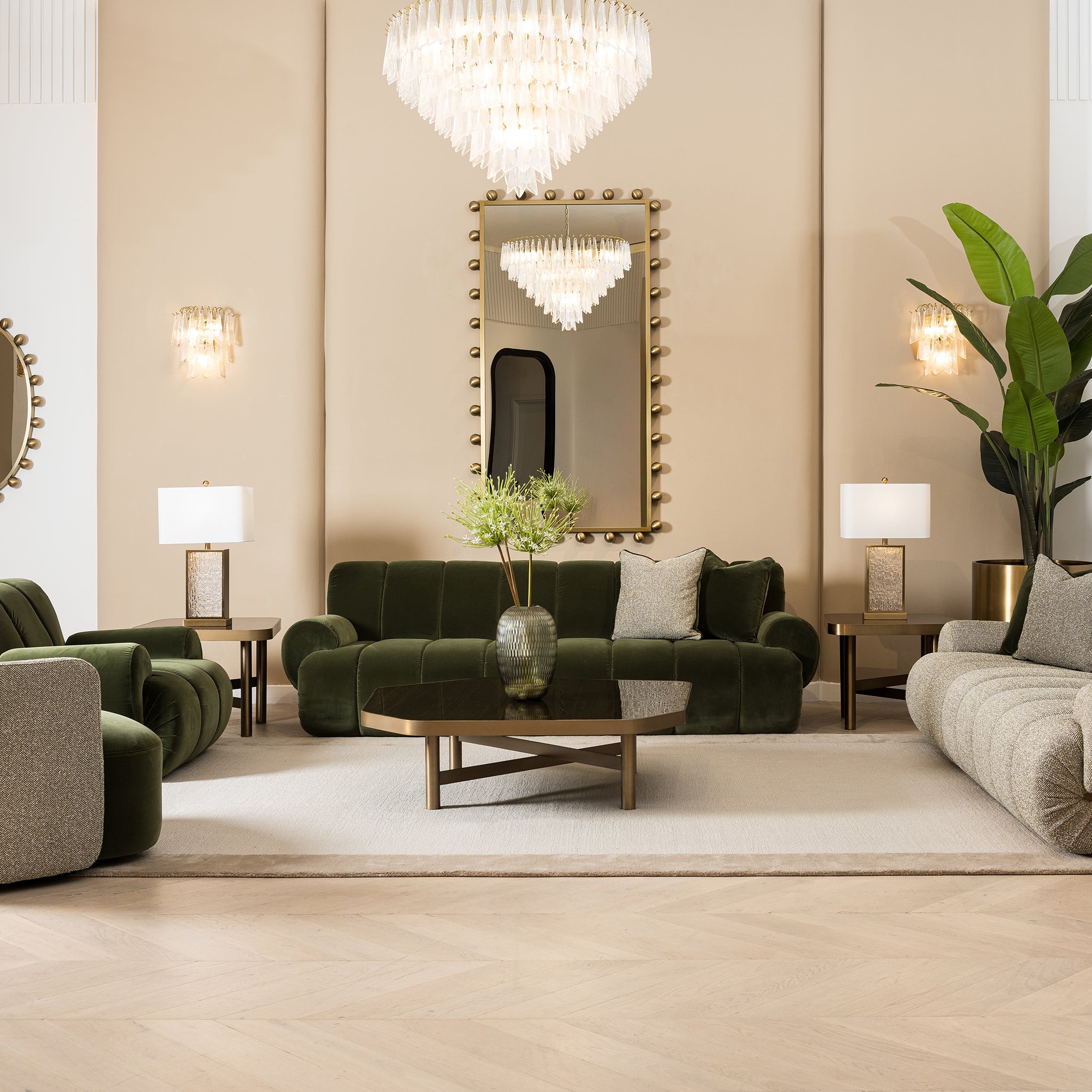 Upholstered in briar emerald, this sofa brings a sense of calm sophistication to any space. Vertical channeling nods to art deco style, while stainless steel accents in a brushed bronze finish elevate the design with a subtle metallic touch that adds depth and modern elegance.