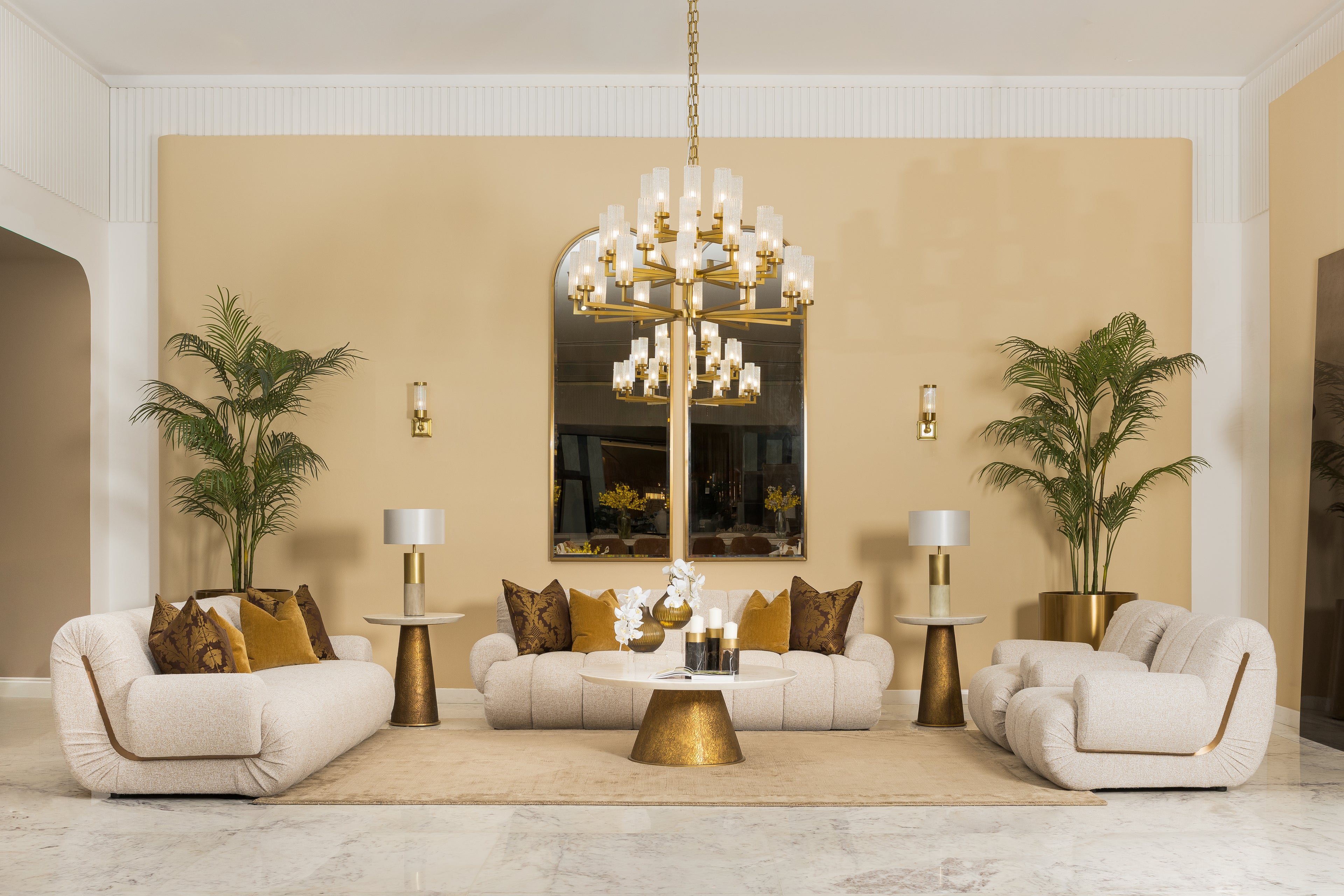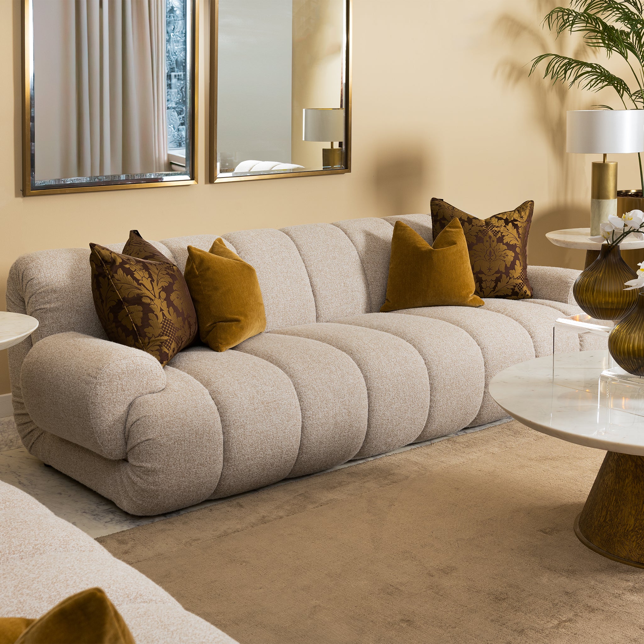 Upholstered in erica oatmeal fabric, this sofa brings a sense of calm sophistication to any space. Vertical channeling along the backrest adds texture and structure, nodding to classic art deco styling. Accented with stainless steel in a brushed bronze finish, the design is elevated with a subtle metallic touch that adds richness and modern elegance.