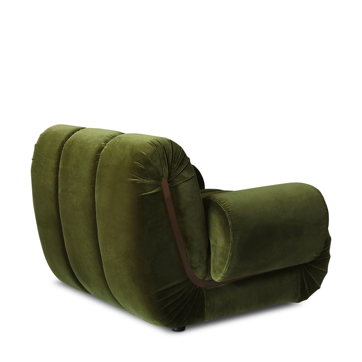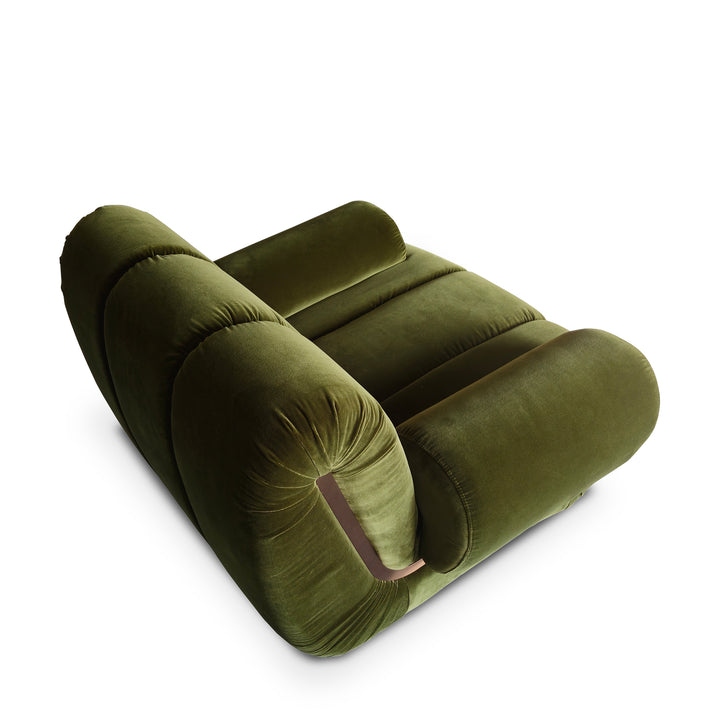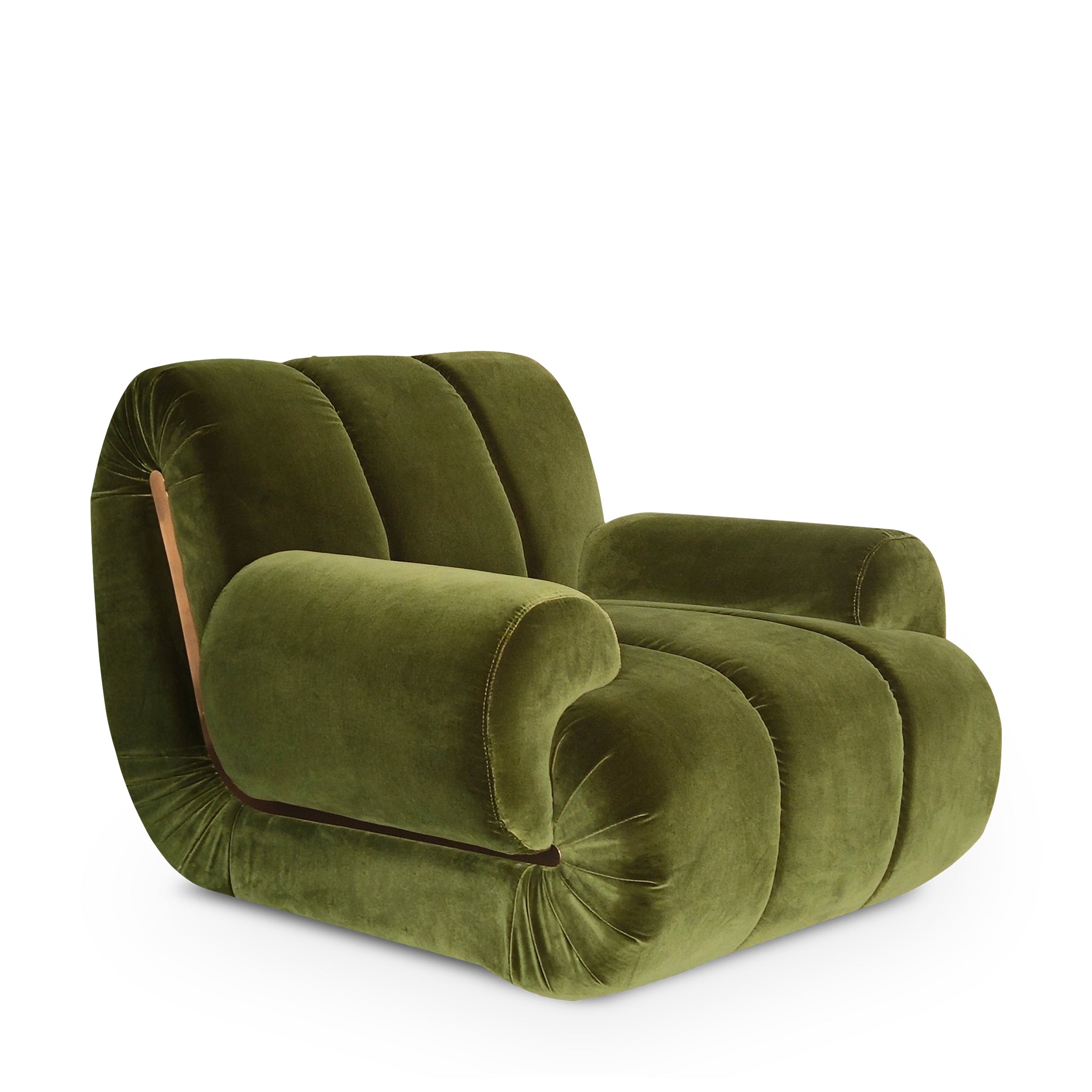 Complementing the jeremy emerald 3-seater sofa, this armchair showcases luxury with metal accents in a brushed bronze finish. Upholstered in briar emerald cotton velvet fabric, it features subtle vertical channeling inspired by the art deco movement.
