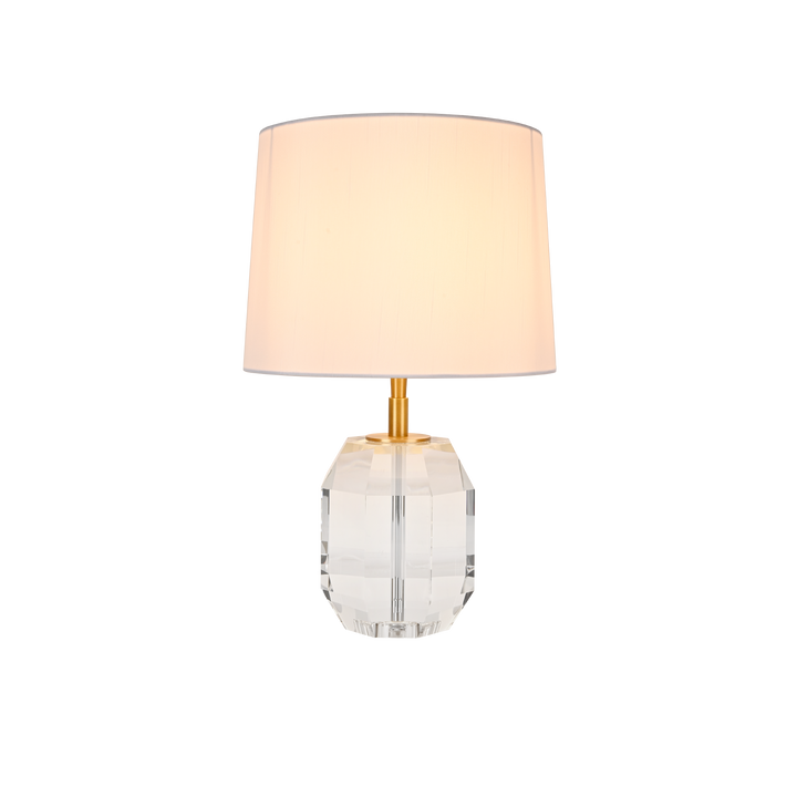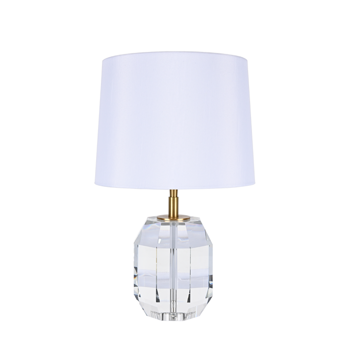 A faceted crystal base brings sculptural elegance to this table lamp, inspired by the timeless glamour of art deco design. The geometric form enhances its visual depth, balanced by a white shade.