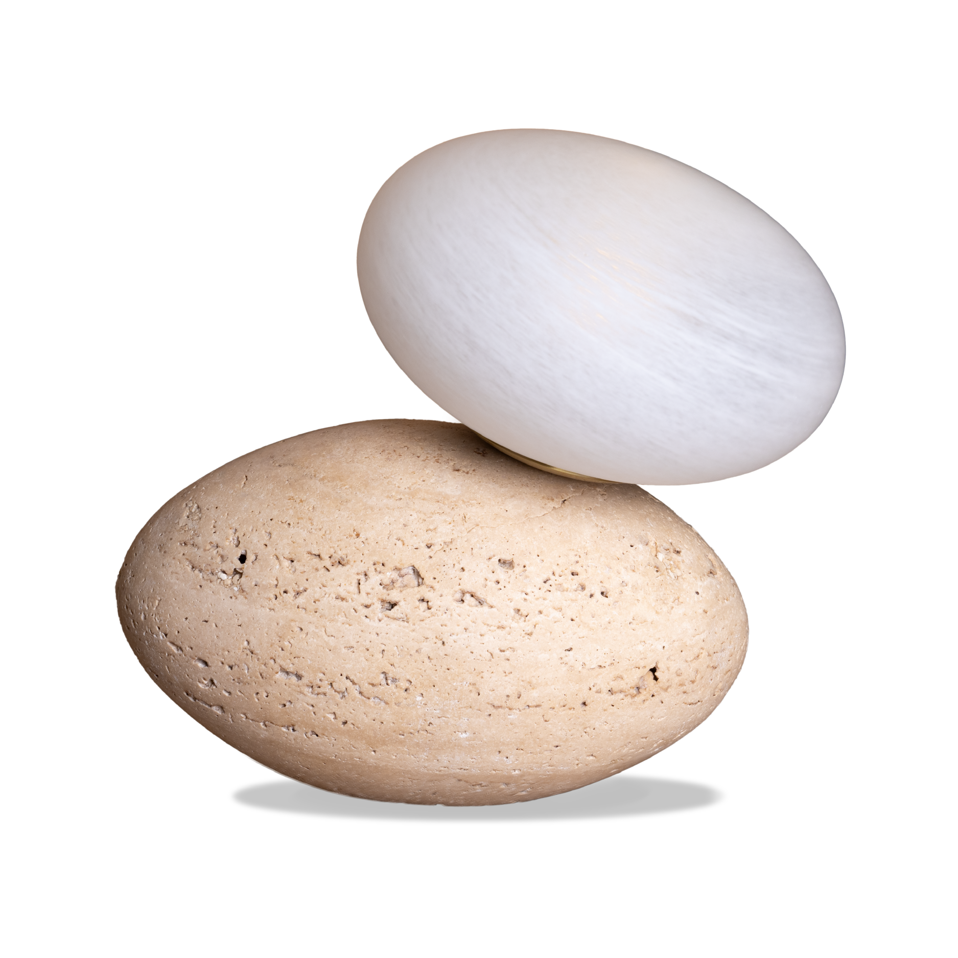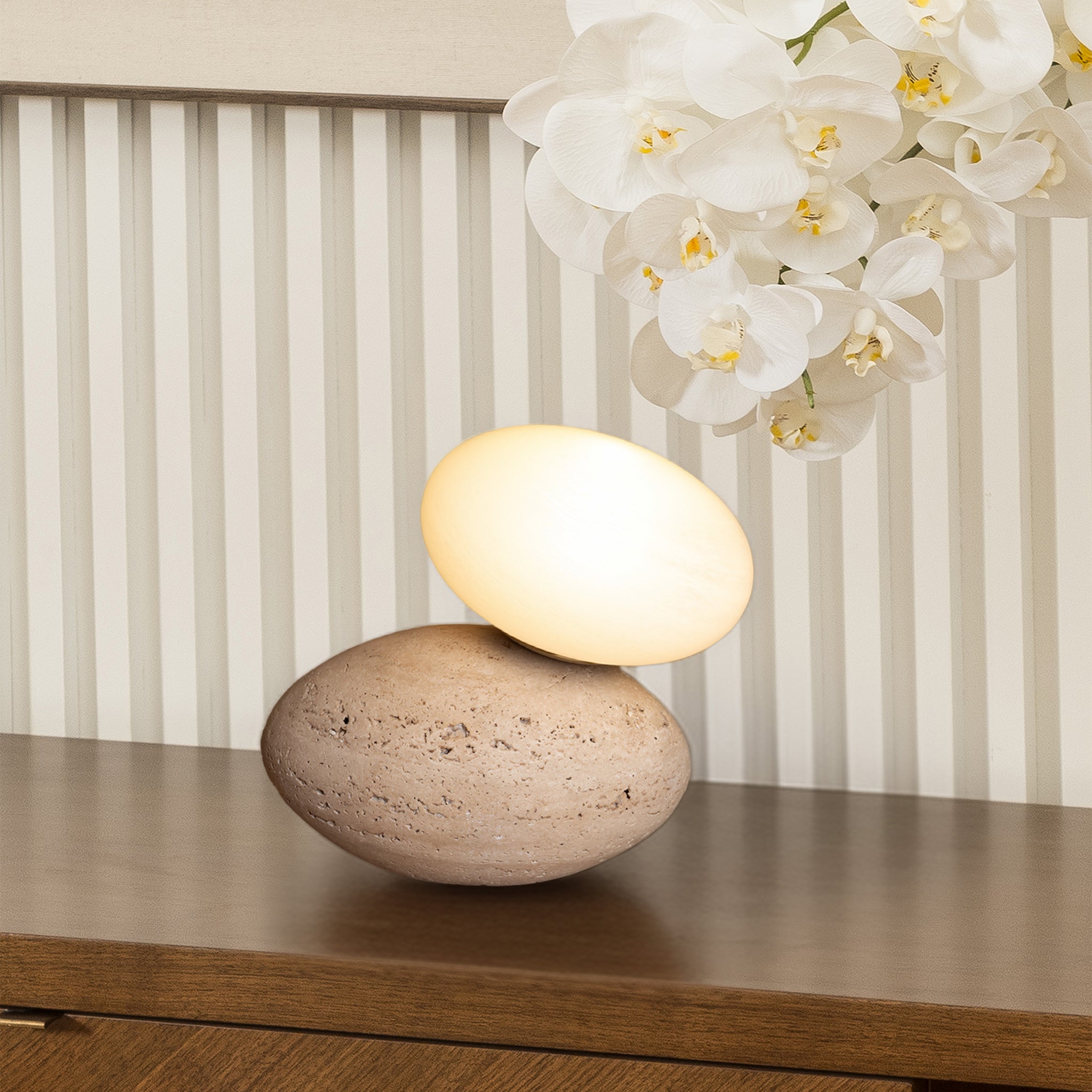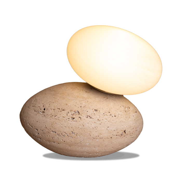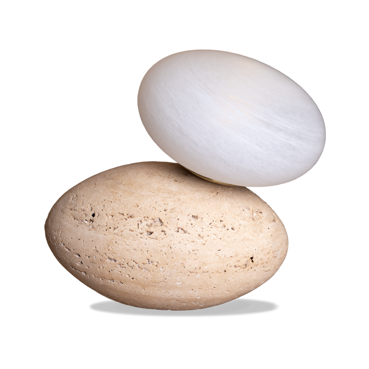 Reflecting the harmony of natural elements, this table lamp pairs organic texture with refined form. The travertine base and white cloudy glass shade create a composition of timeless elegance.