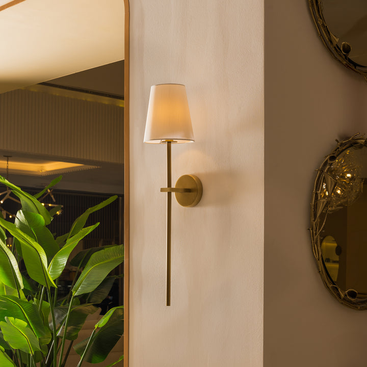 An elongated brass stem crowned with a refined fabric shade gives this wall sconce its transitional elegance.It provides a soft glow that works well in different spaces. Suitable for use in hallways, bedrooms, or living areas.