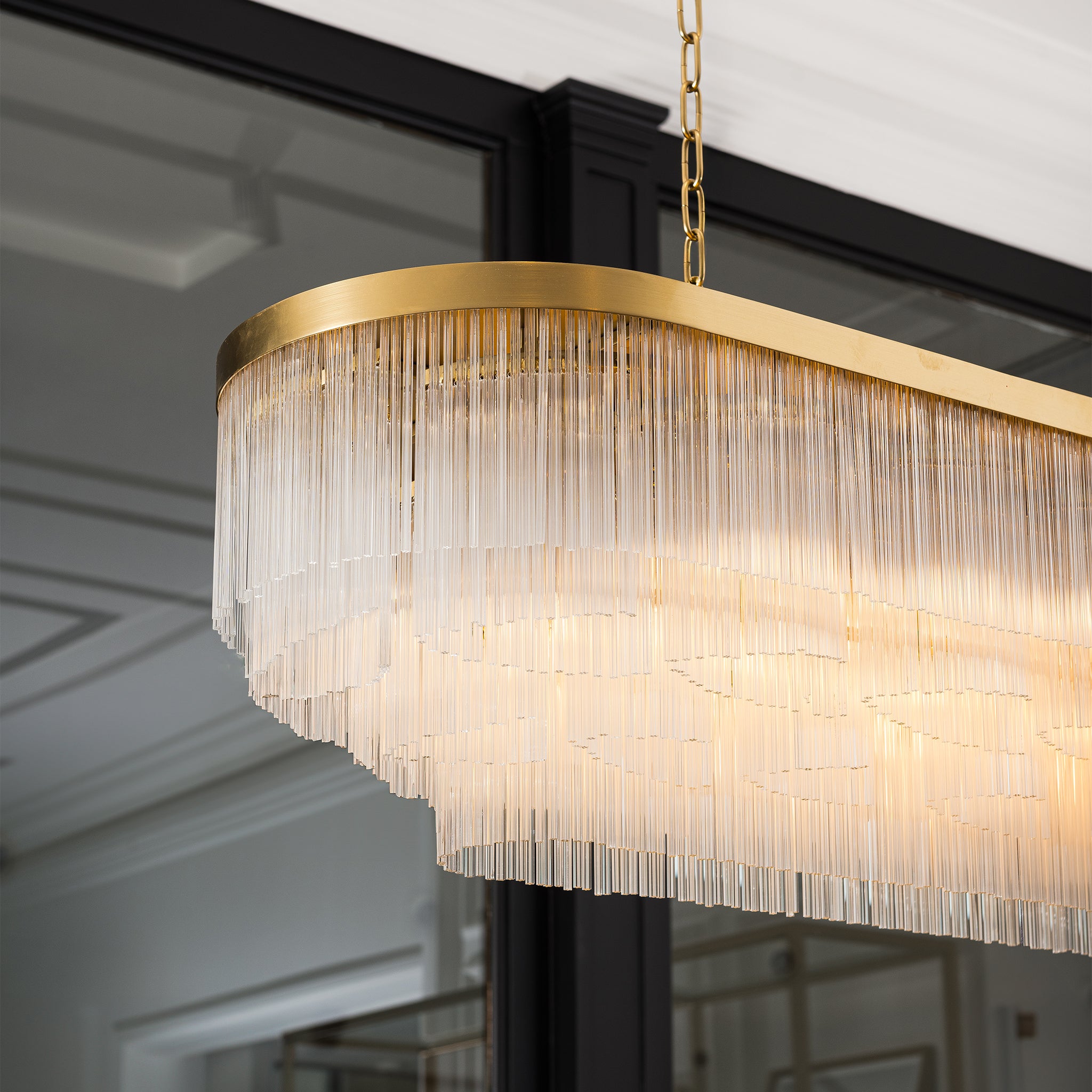 This linear chandelier brings a fresh take on classic art deco style. Each glass piece is meticulously set by hand, a process demanding precision, patience, and exceptional craftsmanship.