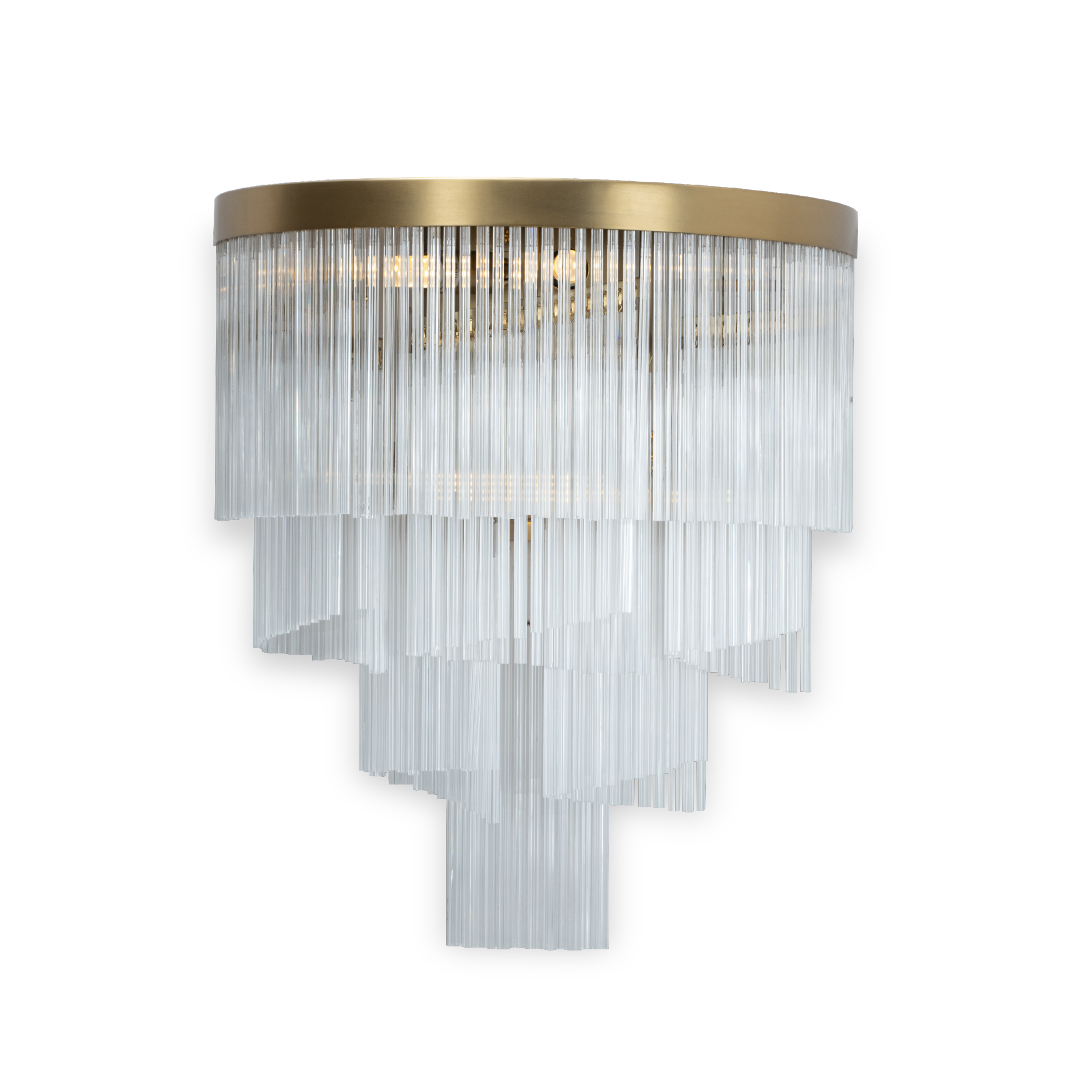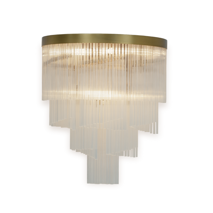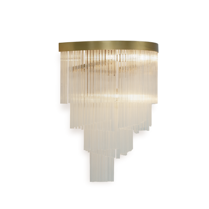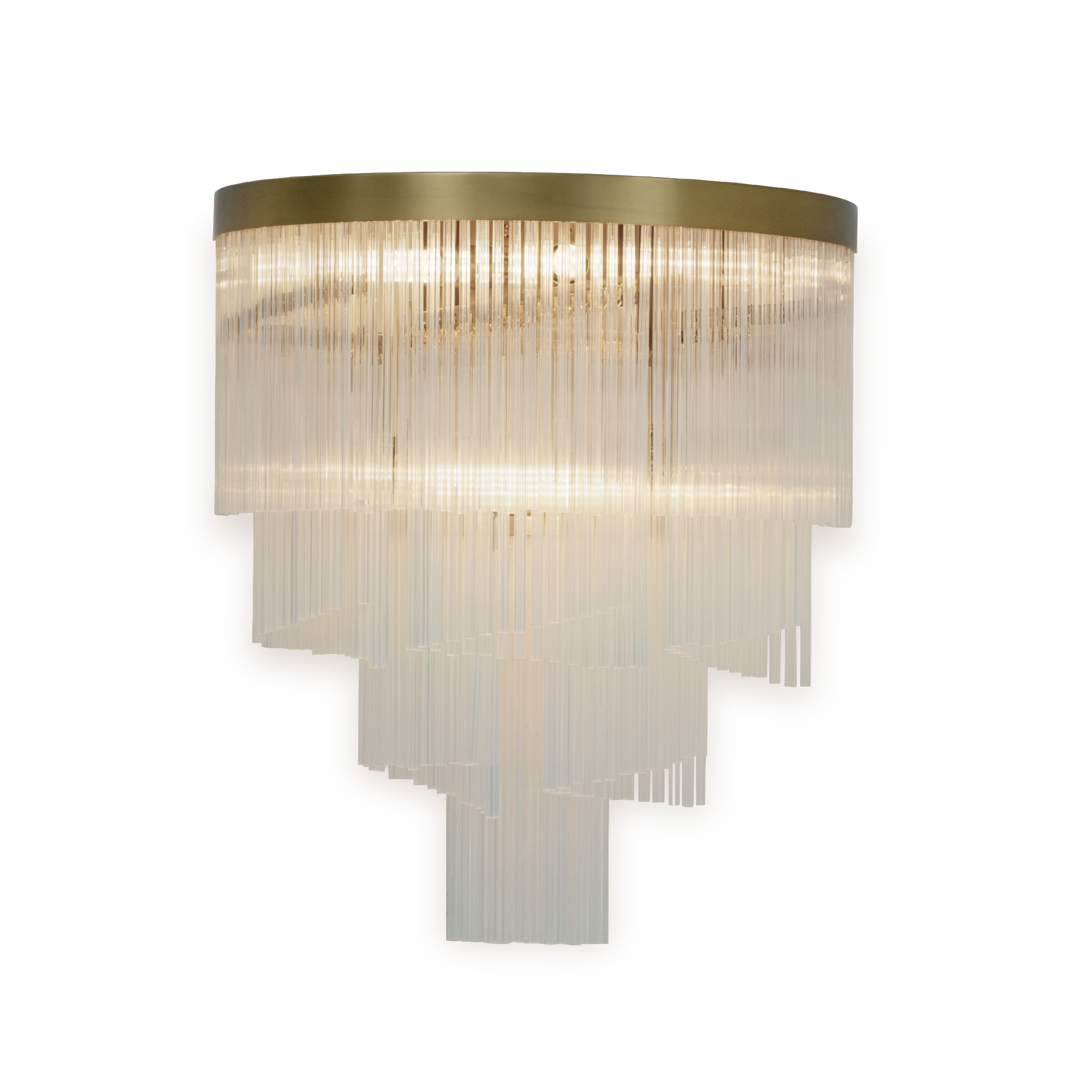 Designed to complement the chandeliers in the kenza series, this wall lamp features vertical strands of glass that shimmer with subtle elegance. Each glass piece is installed by hand, a process that demands precision, patience, and exceptional craftsmanship.