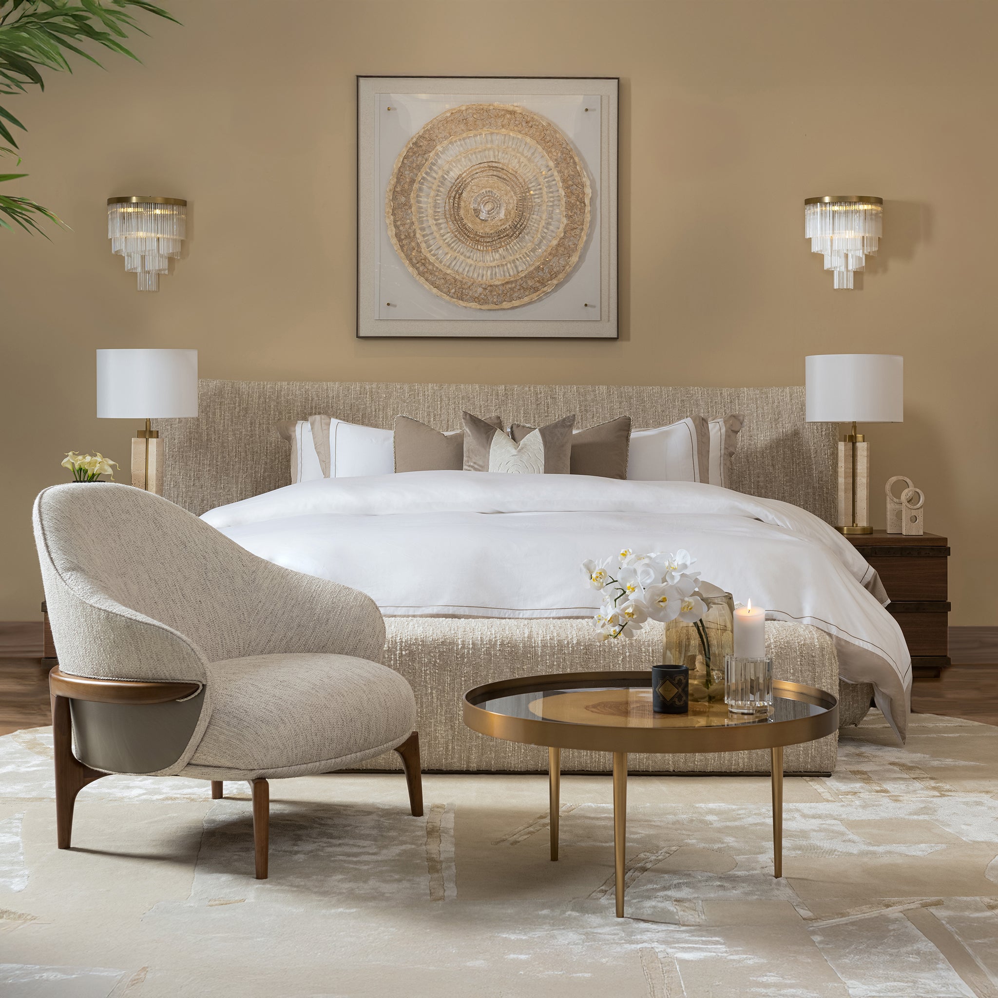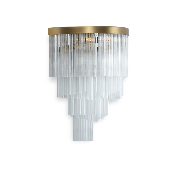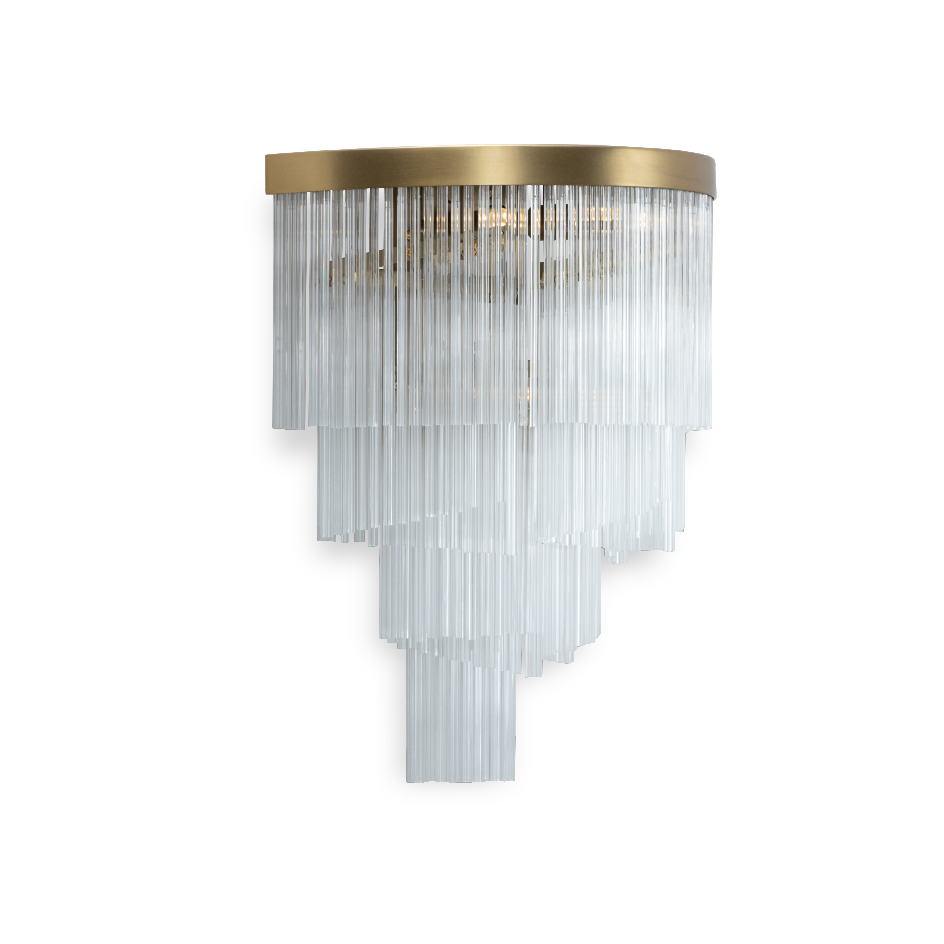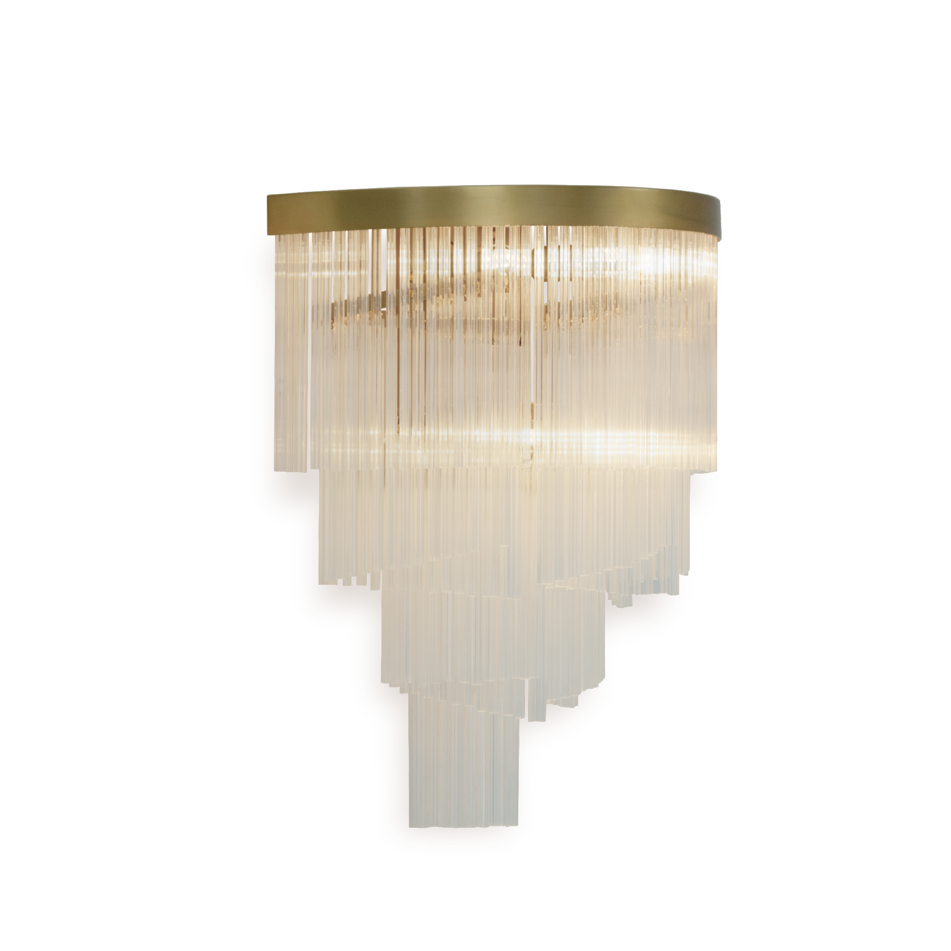 Designed to complement the chandeliers in the kenza series, this wall lamp features vertical strands of glass that shimmer with subtle elegance. Each glass piece is installed by hand, a process that demands precision, patience, and exceptional craftsmanship.