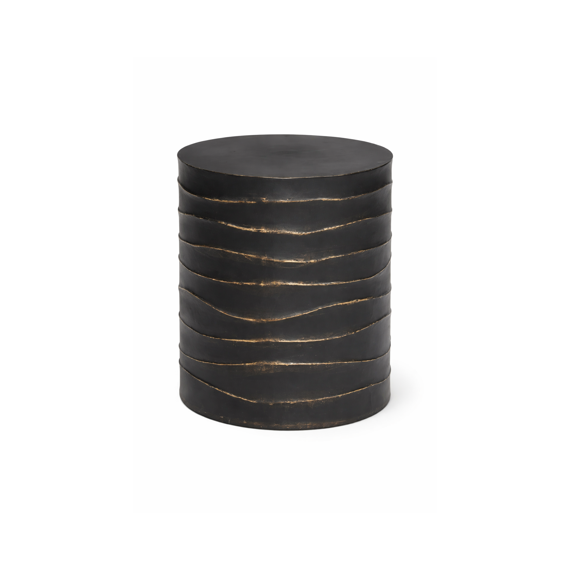 Inspired by layered natural formations, this end table features a bold cylindrical form with sculpted horizontal ridges. Subtle brass edging adds refined contrast to the rich vintage bronze finish. Natural variations in color and texture make each piece unique, while its glass reinforced concrete construction ensures durability for indoor and outdoor use.