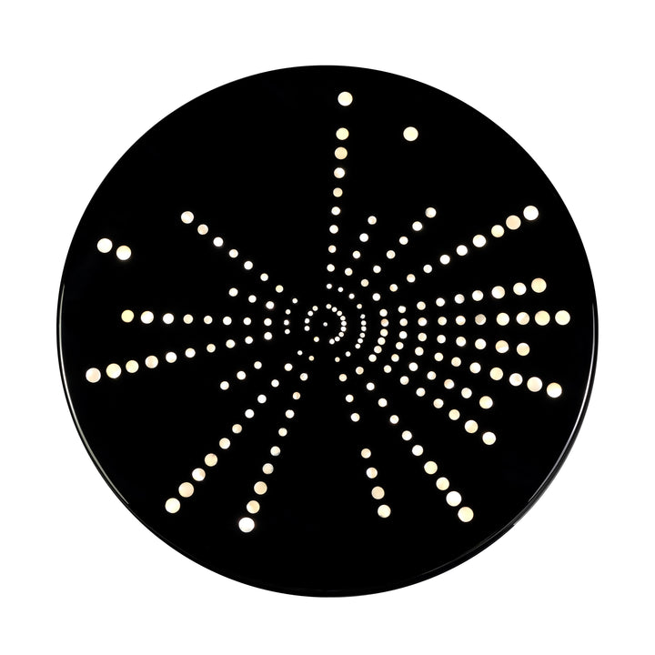 Glossy lacquered surface with delicate white mother of pearl inlays shapes a compact round silhouette of timeless sophistication.