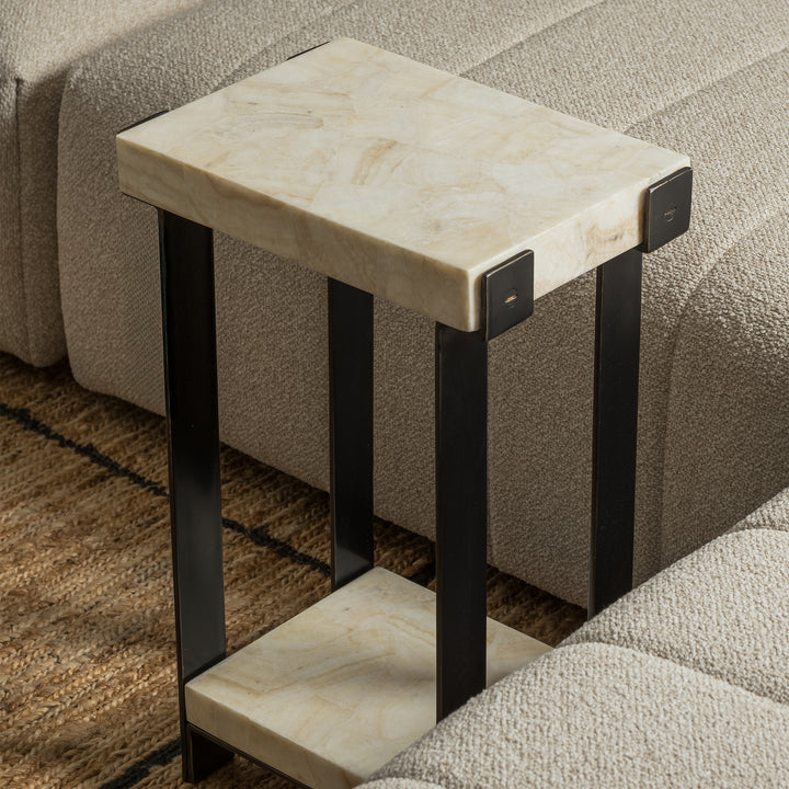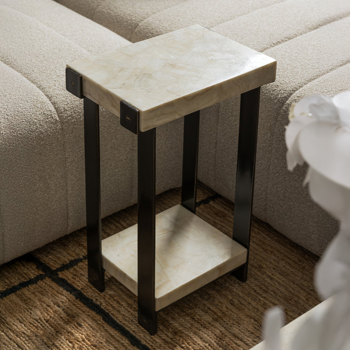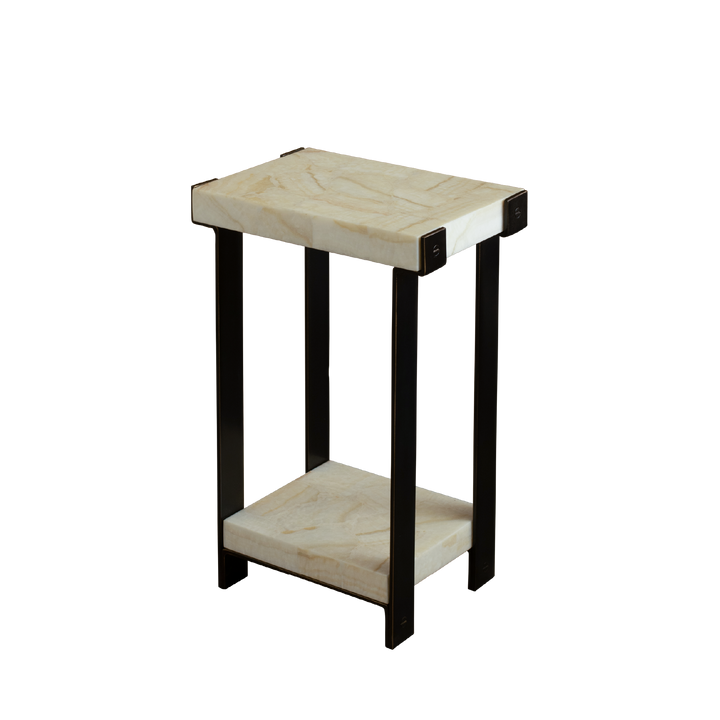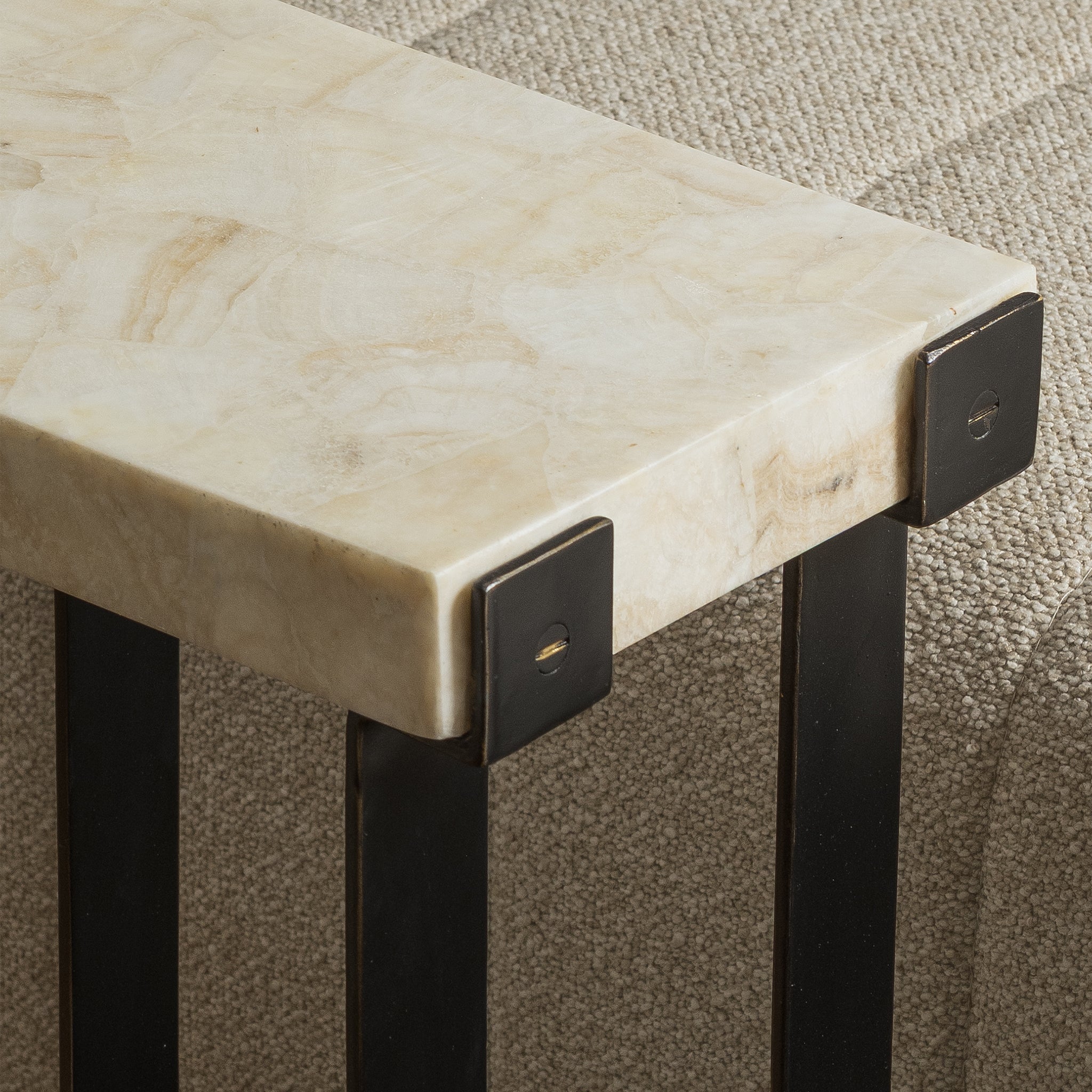 The top and bottom shelves feature polished crystal stone sourced from the Philippines. Steel flat-bar legs in an oil-rubbed bronze finish provide a strong yet refined form.