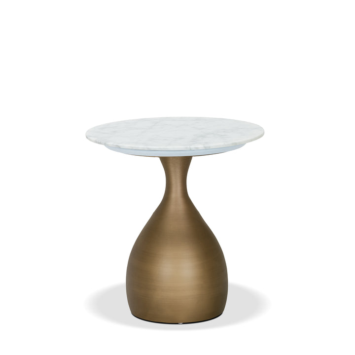 This end table brings together the beauty of natural stone and modern design. The white natural marble top features unique veining that makes each piece one of a kind. The sculptural teardrop base in brushed brass accentuates its graceful silhouette.