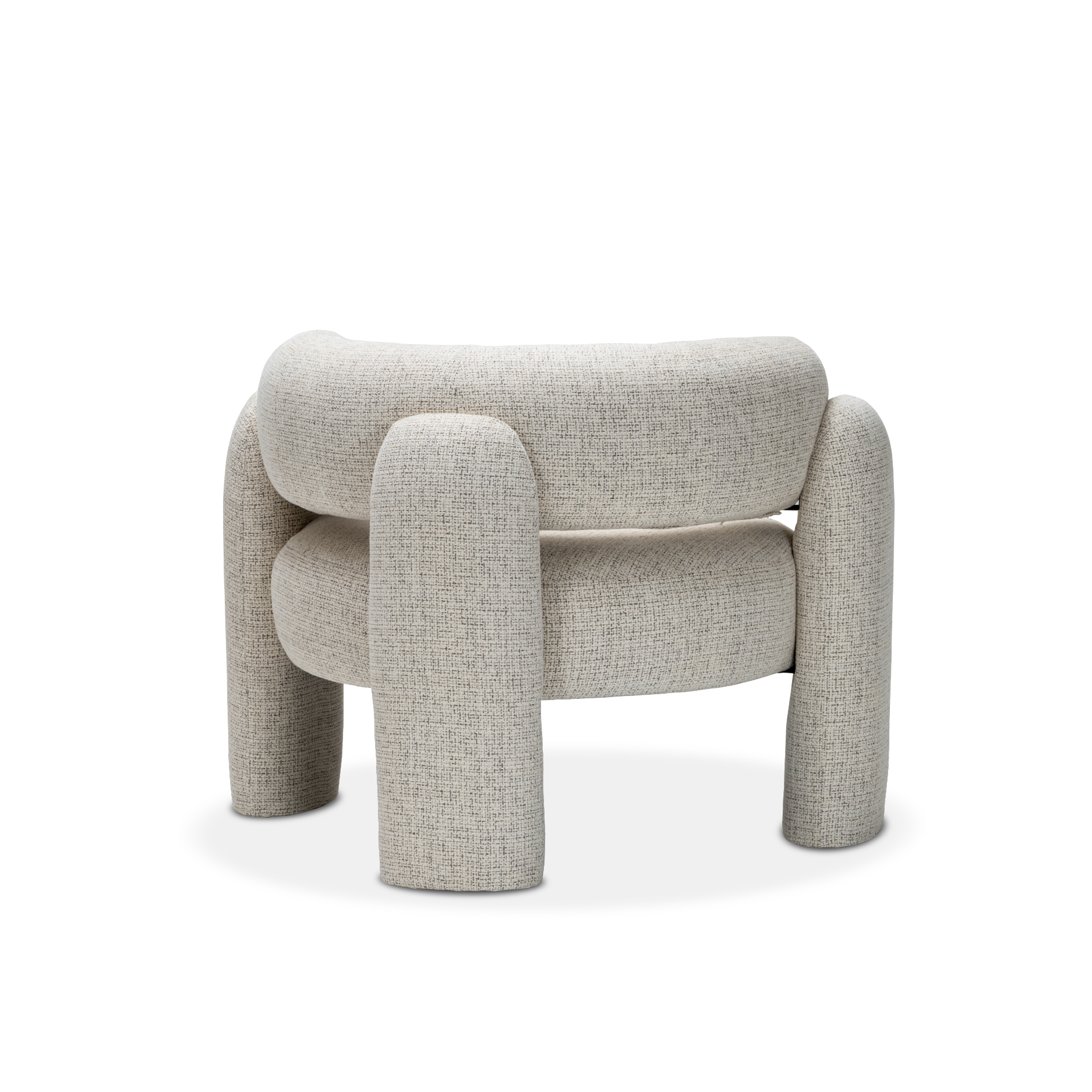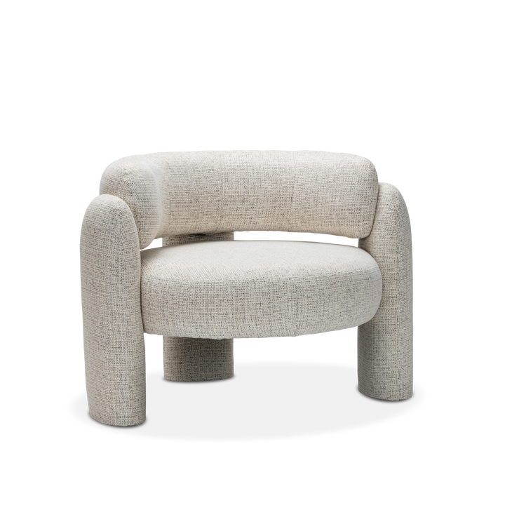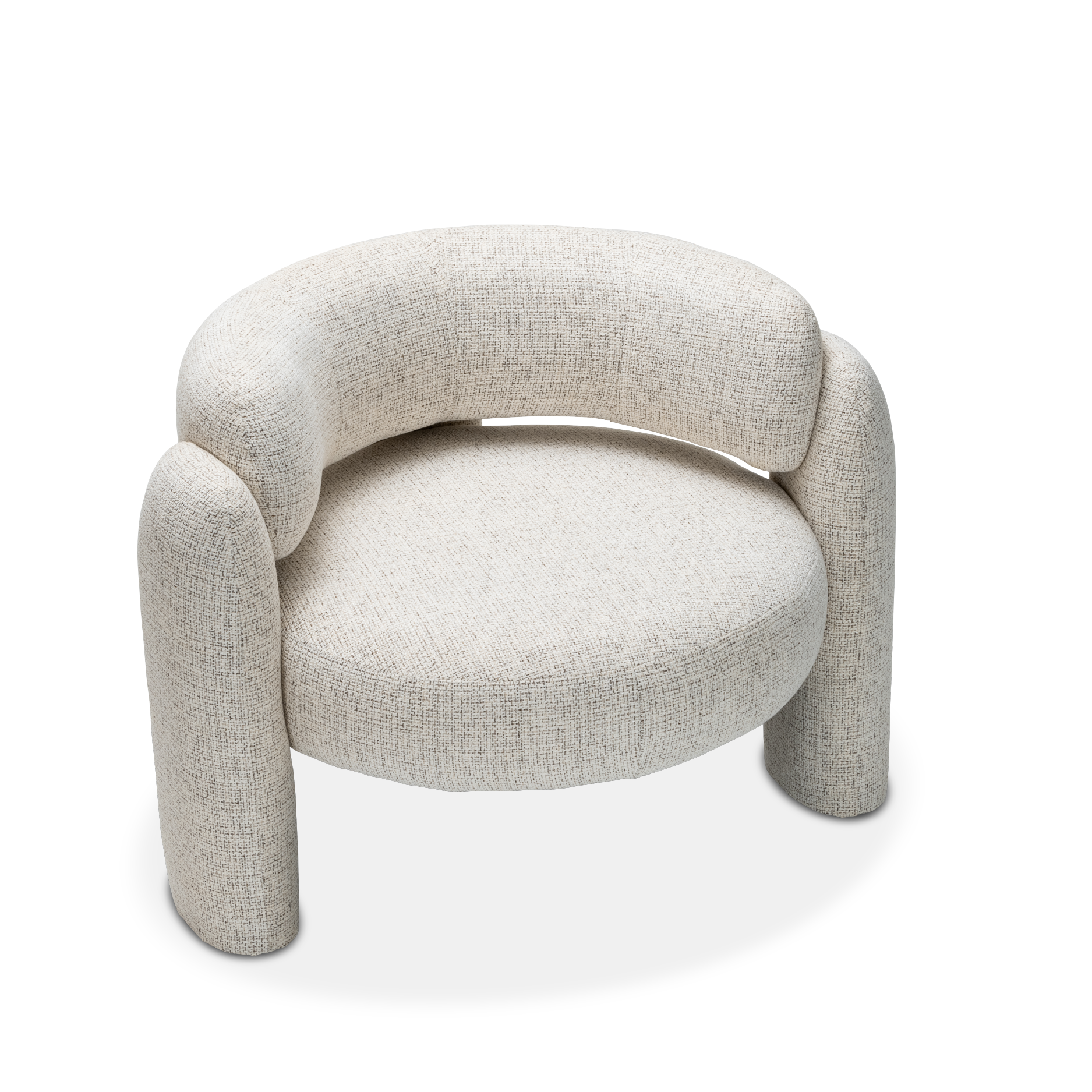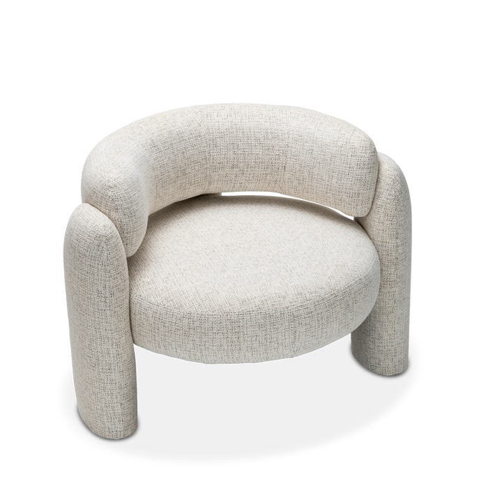 Upholstered in gabrielle oatmeal fabric, this chair stands out with its distinctive silhouette and eye-catching form. The round seat is separated from the curved backrest, creating a sculptural profile that adds a sense of lightness and modernity. The legs enhances the visual appeal while providing stability.