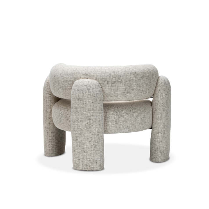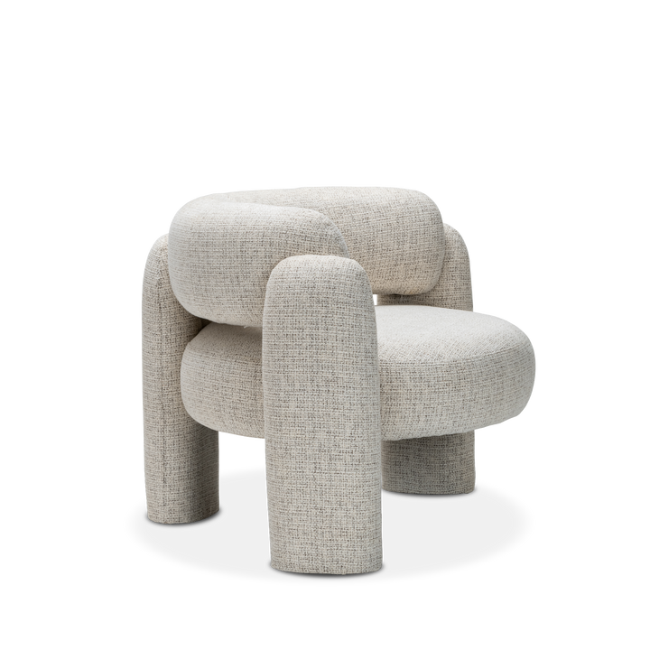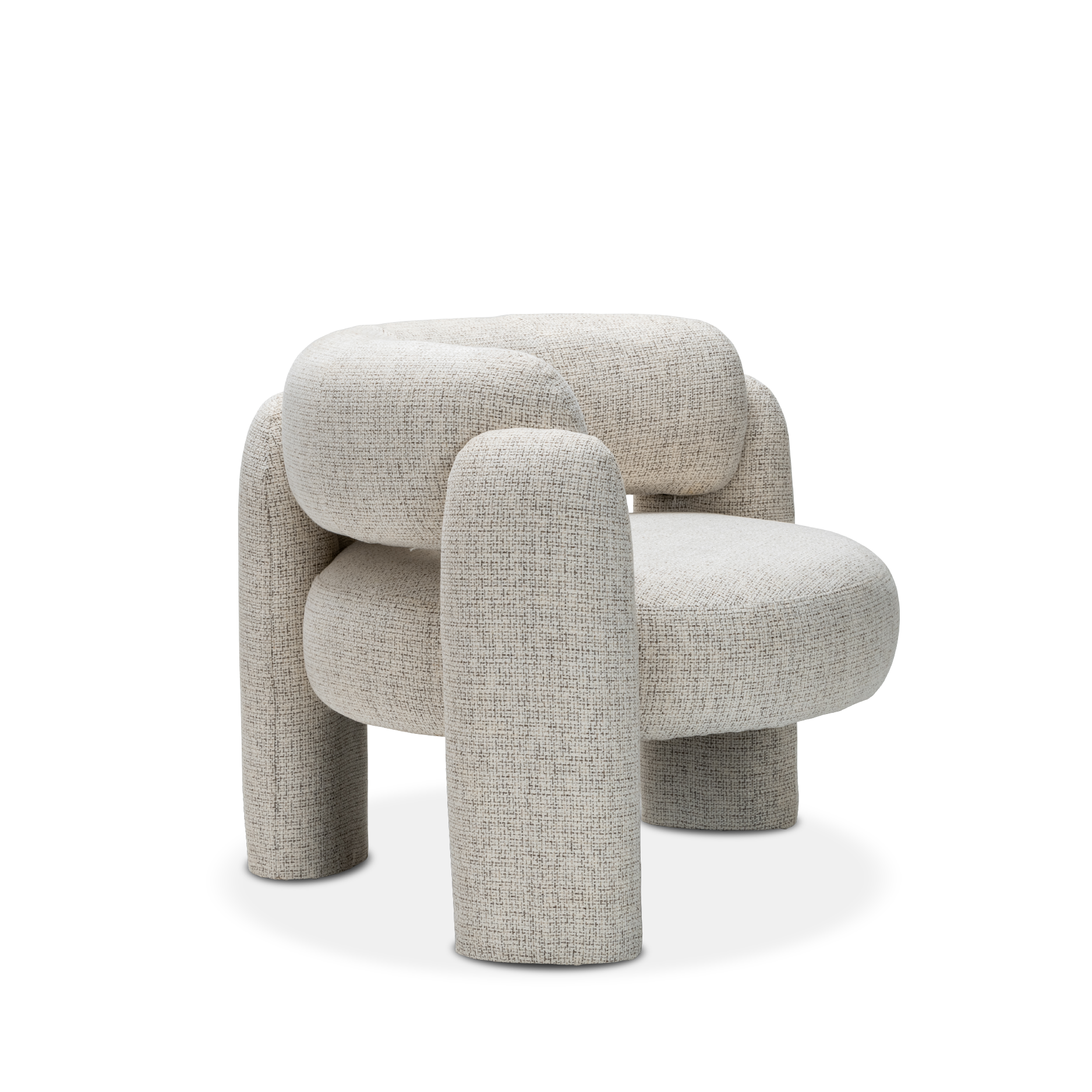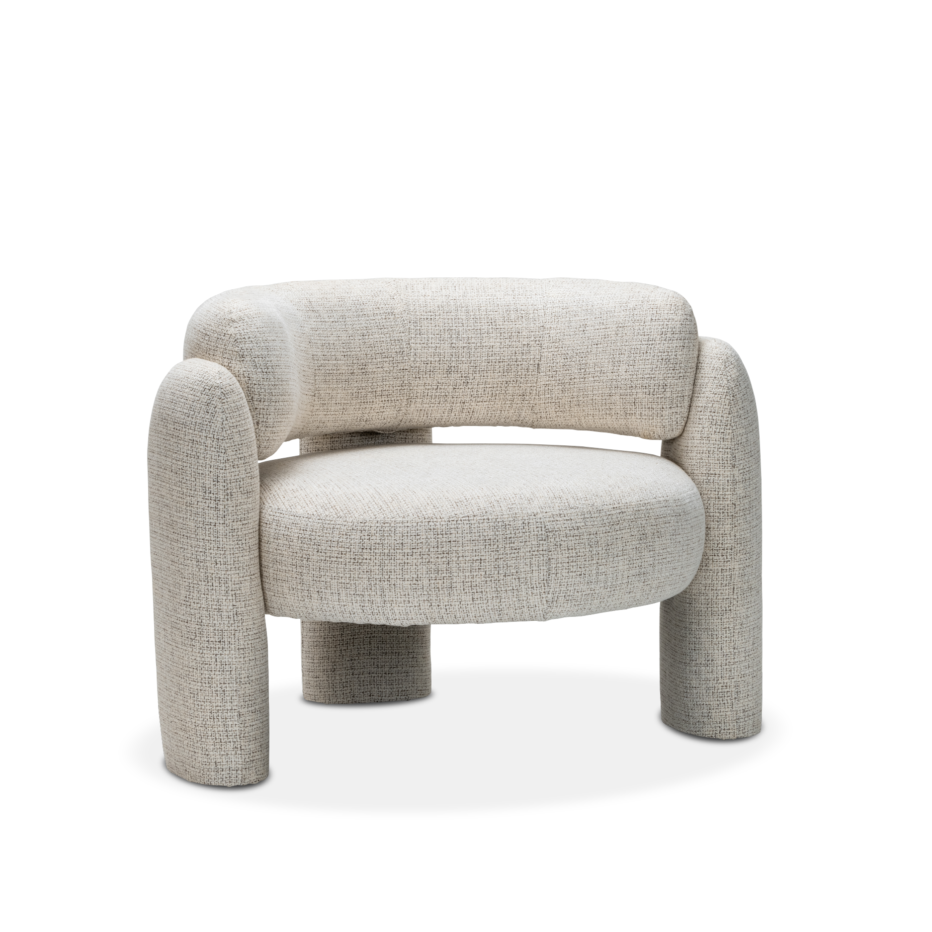 Upholstered in gabrielle oatmeal fabric, this chair stands out with its distinctive silhouette and eye-catching form. The round seat is separated from the curved backrest, creating a sculptural profile that adds a sense of lightness and modernity. The legs enhances the visual appeal while providing stability.