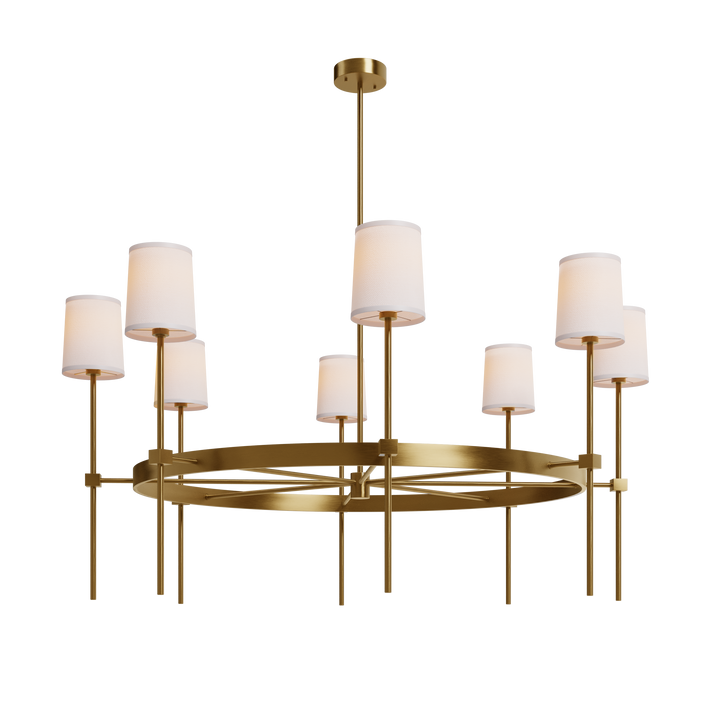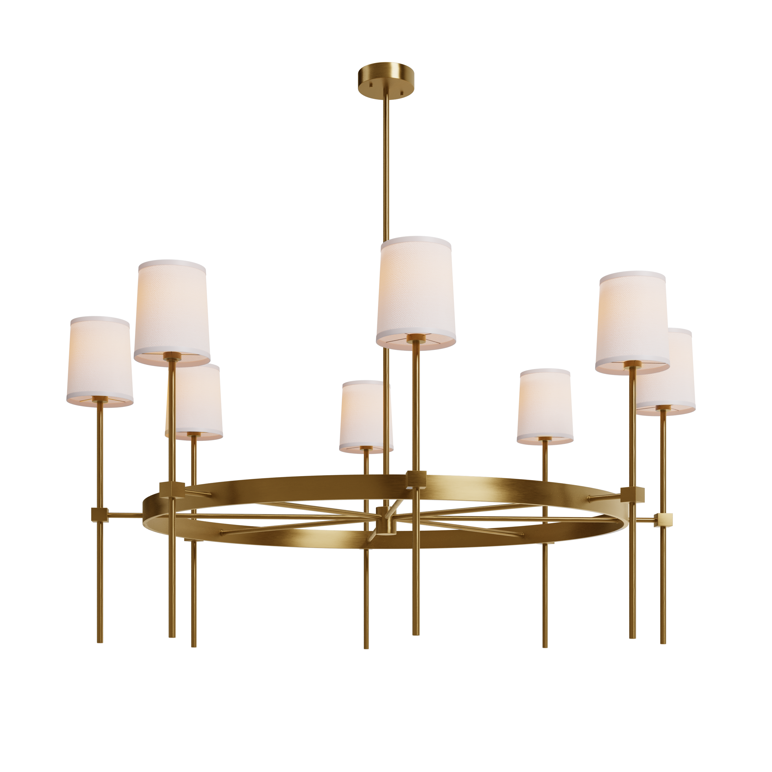 Modern and minimal, this chandelier features a circular steel frame in a brass finish with eight slender arms. Each arm holds a white linen shade for a clean, refined look.