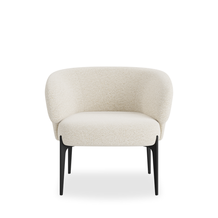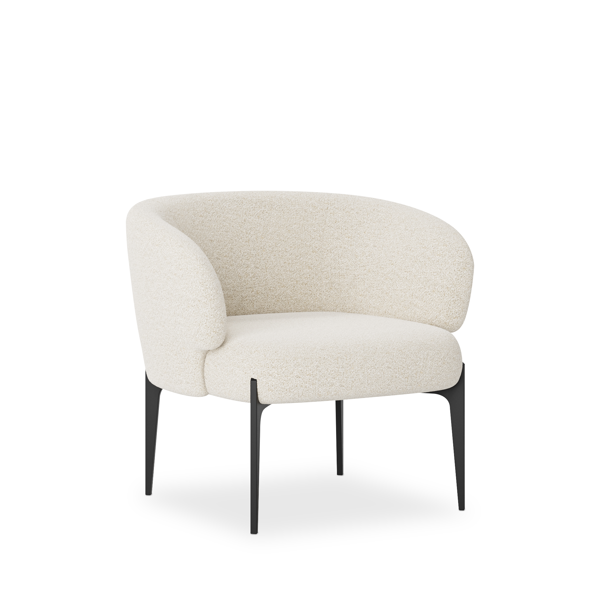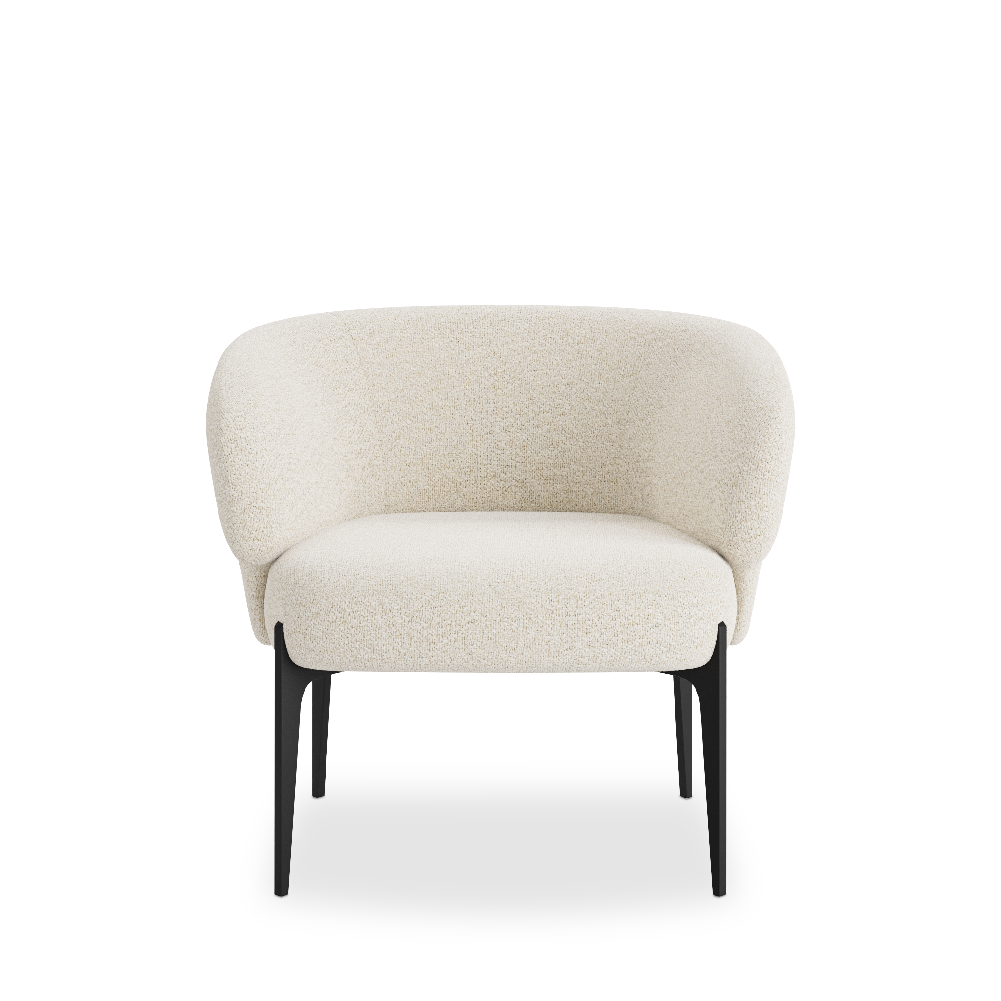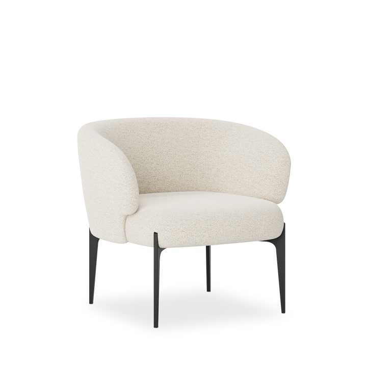 Upholstered in jute beige fabric, this chair offers both comfort and style. Its sturdy iron legs are powder-coated in matte jet black, providing a sleek and modern contrast that enhances any room’s decor.