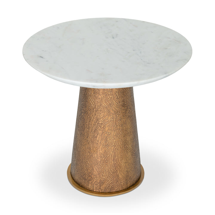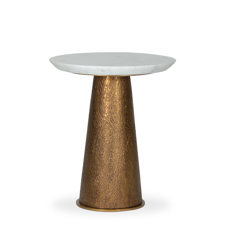 An expression of fine craftsmanship, this end table features a white banswara marble top set on a hand-hammered base. The detailed textured finish highlights the artisan’s skill and gives the piece a unique character.