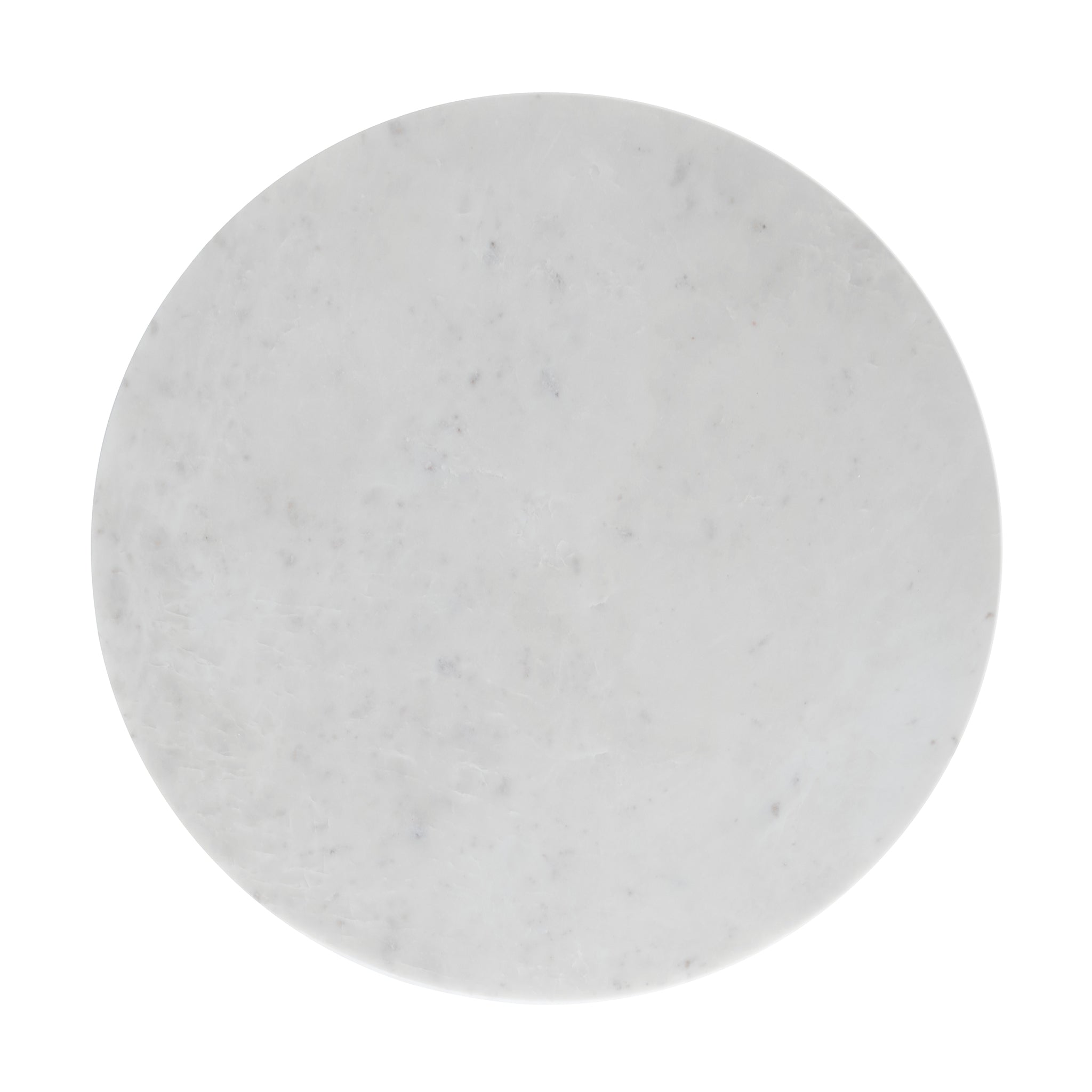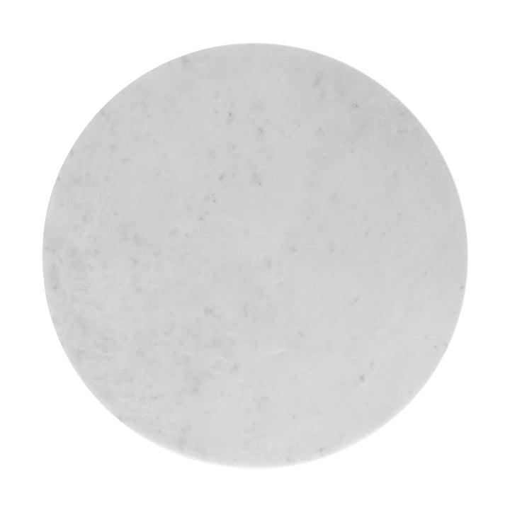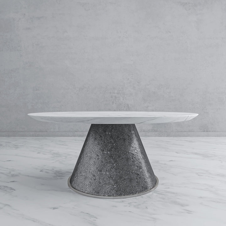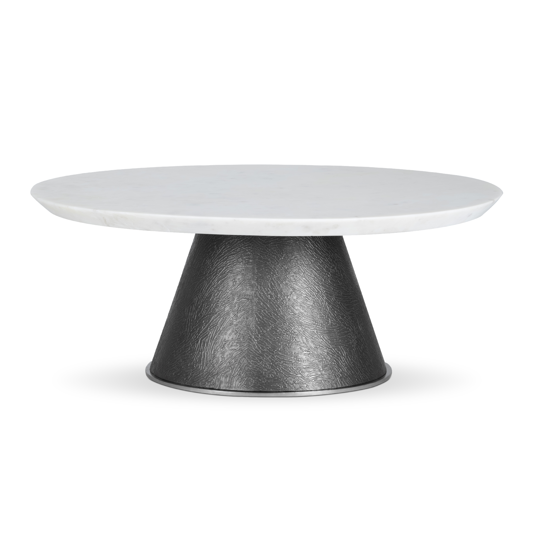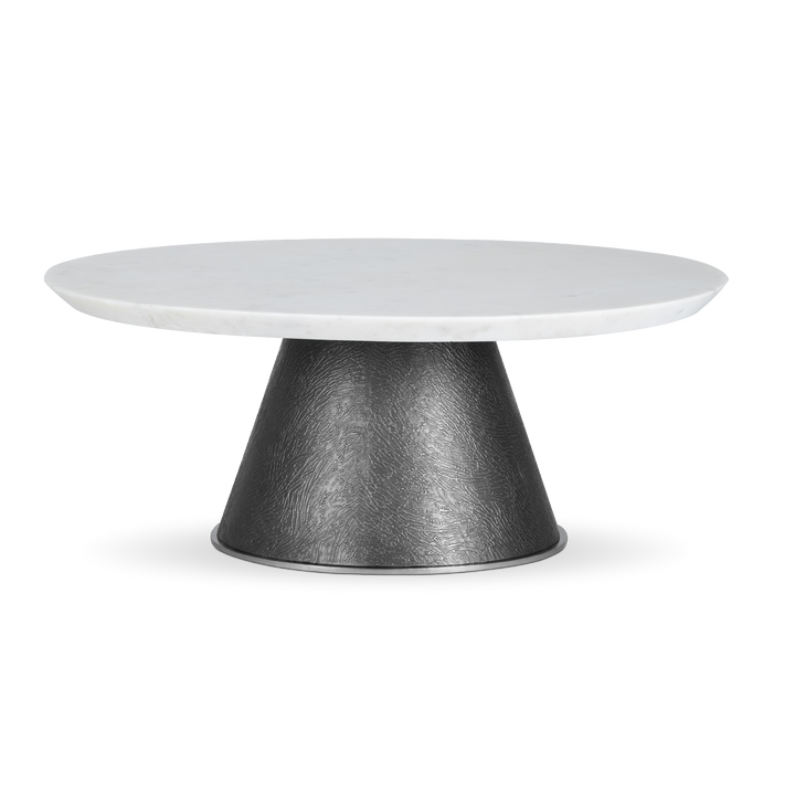 Crafted through the precision and skill of artisan craftsmanship, this coffee table unites a polished white banswara marble top with a hand-textured metal base in burnished silver.