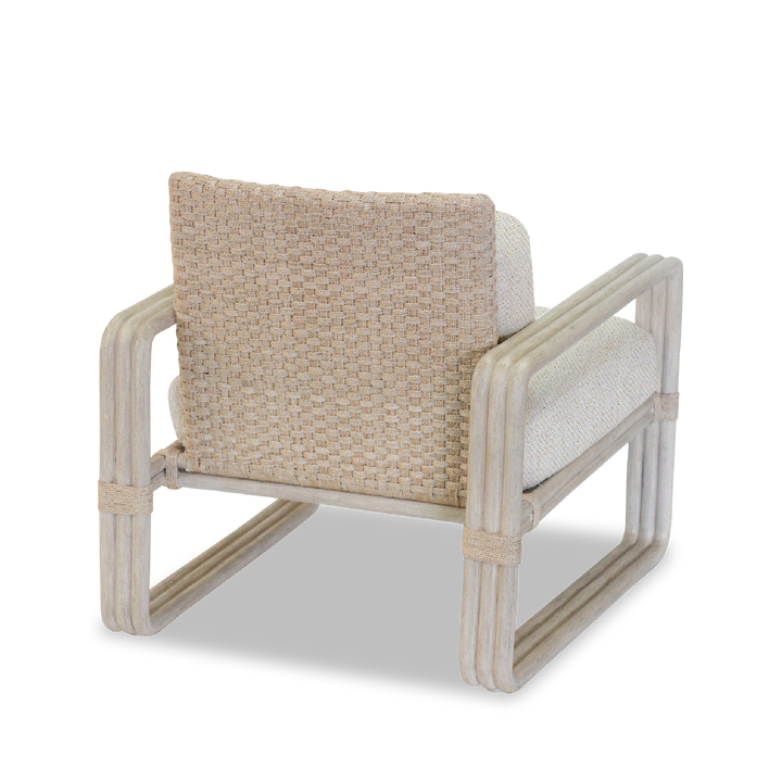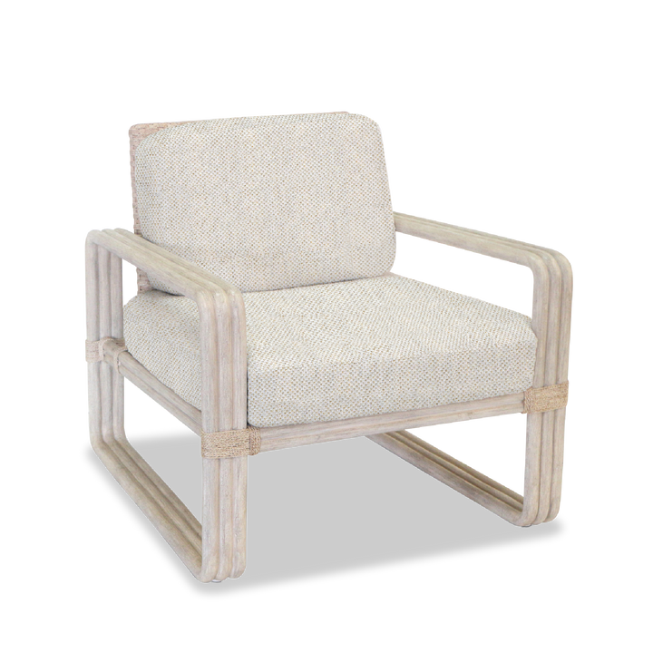 Upholstered in checkers oatmeal fabric, its rattan frame in a matte ceruse white finish brings a natural look that suits any space.