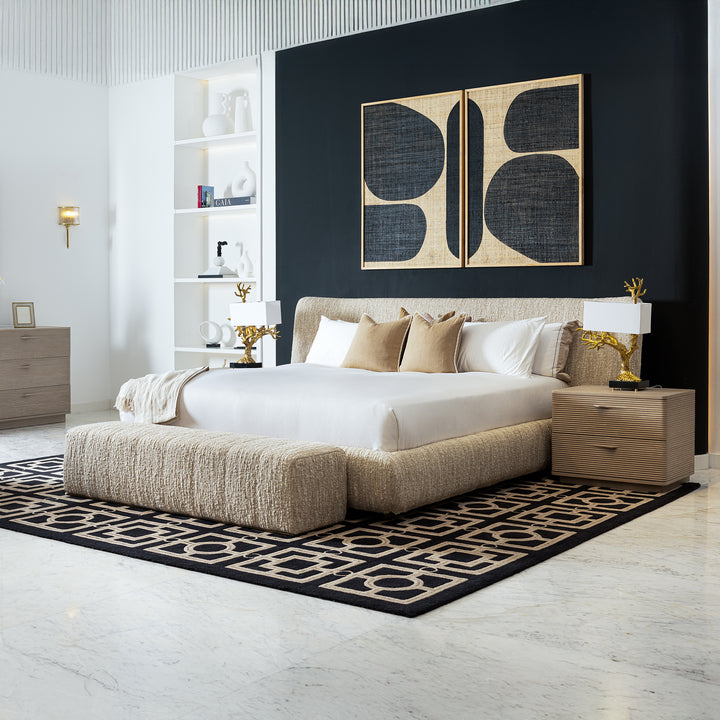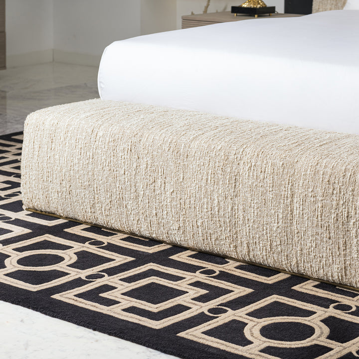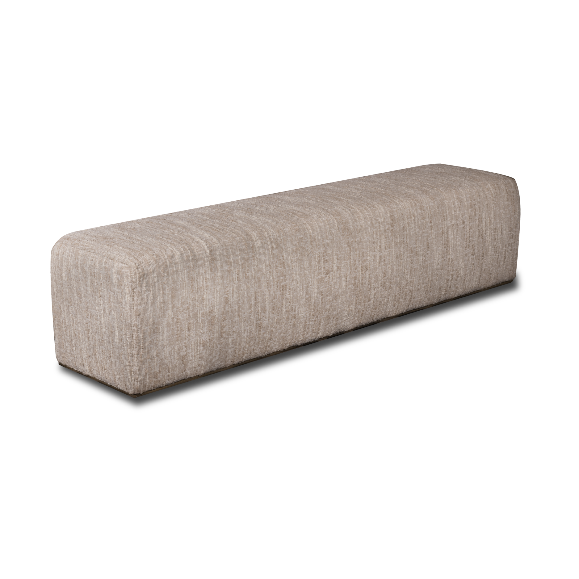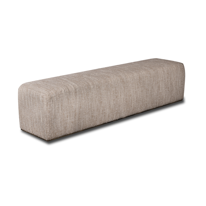 Upholstered in coco angora fabric, the bench offers a sophisticated and inviting seating option. The base is made of stainless steel with an antique brass finish. adding a touch of elegance and timeless appeal to the design.