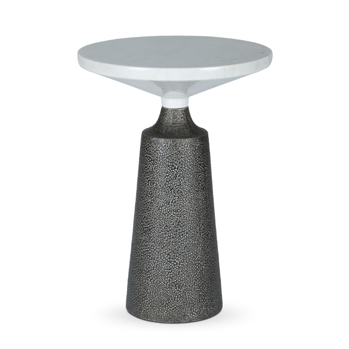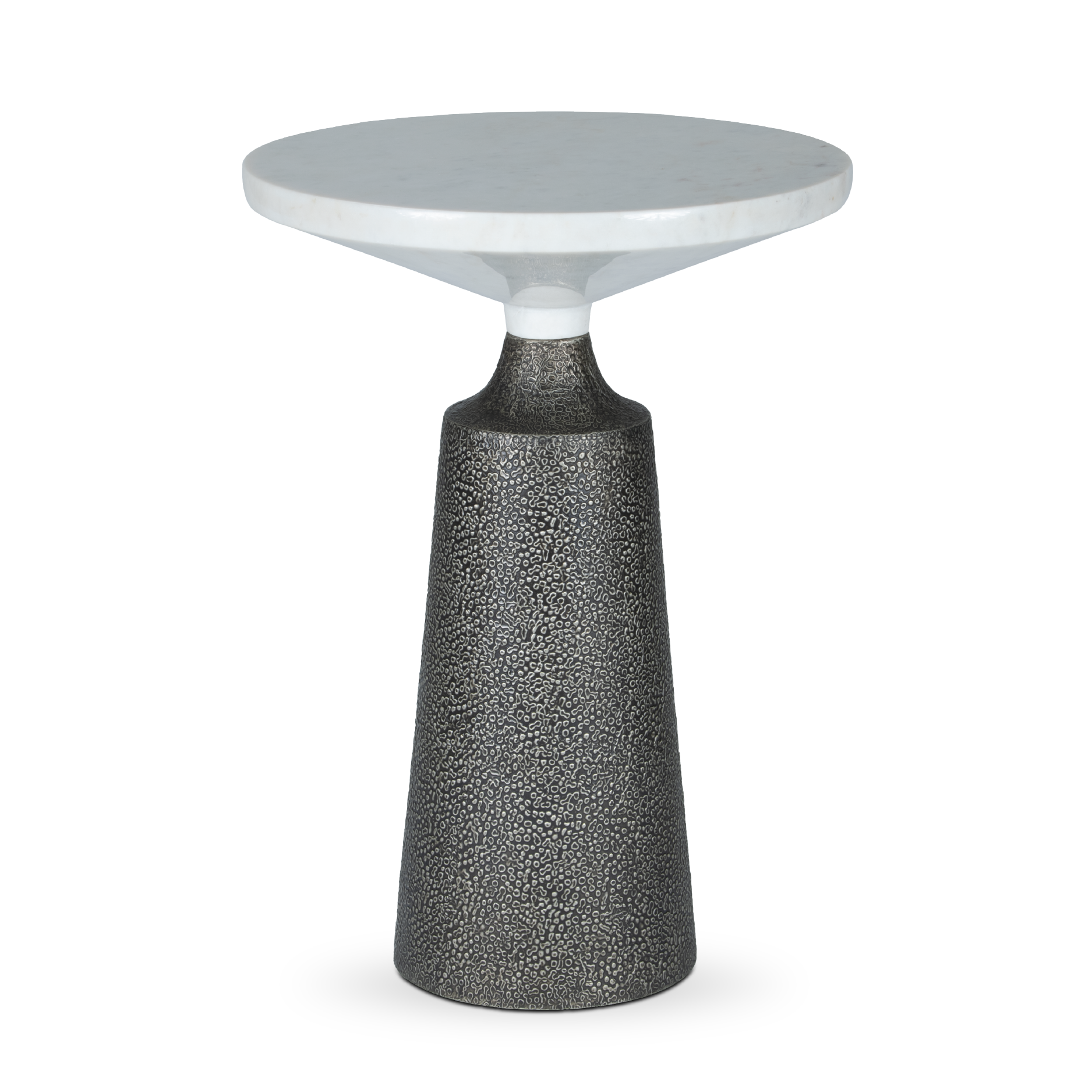 Polished white banswara marble top offers a smooth and clean surface that complements the richness of the base. MDF wood structure in dotted textured white metal sheet cladding in burnished silver finish giving the piece a distinct, sculptural presence and showcasing artisans craftmanship.