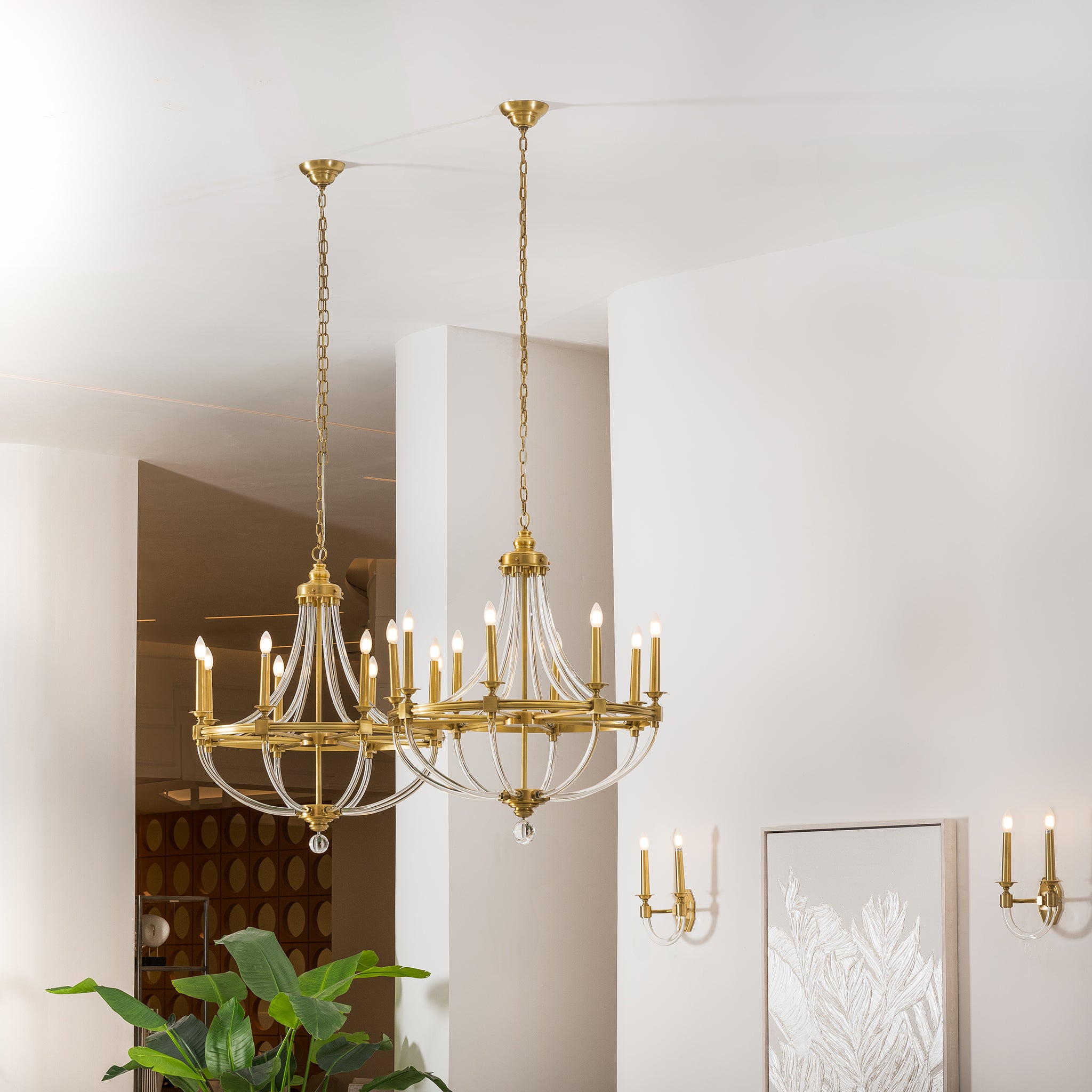 This chandelier features gracefully arched clear glass arms paired with a brass frame in an antique finish, creating a look that is both elegant and timeless. Its well-balanced silhouette blends structure and grace, bringing a sense of refinement to any setting. Candle-style light holders and a central glass sphere complete the piece with a classic touch.