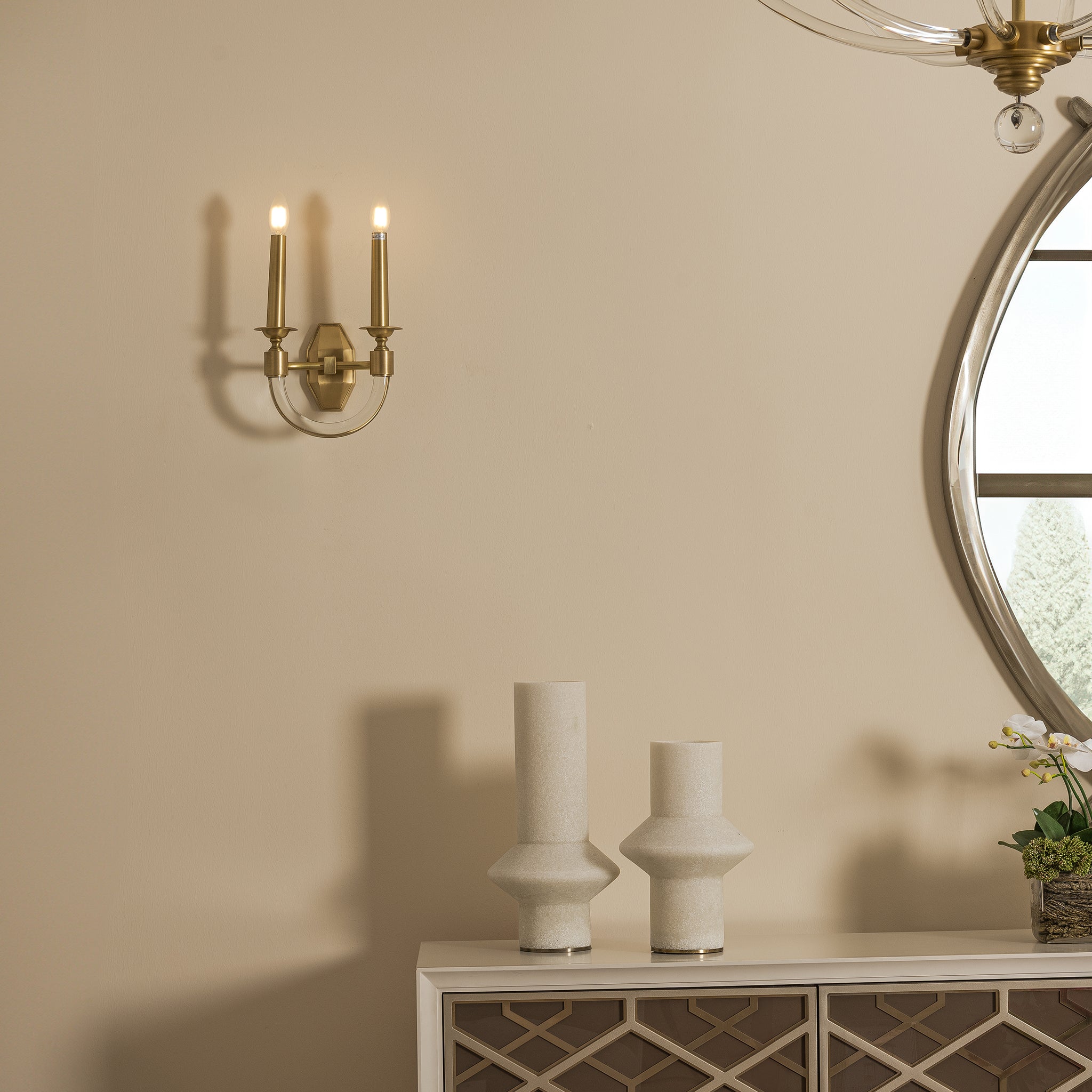 Designed to complement the eleanor chandelier, this piece features candle-style light holders and a central glass sphere that add a classic touch.