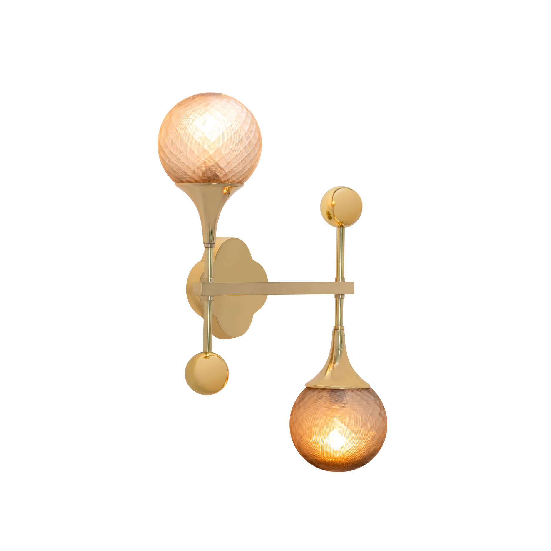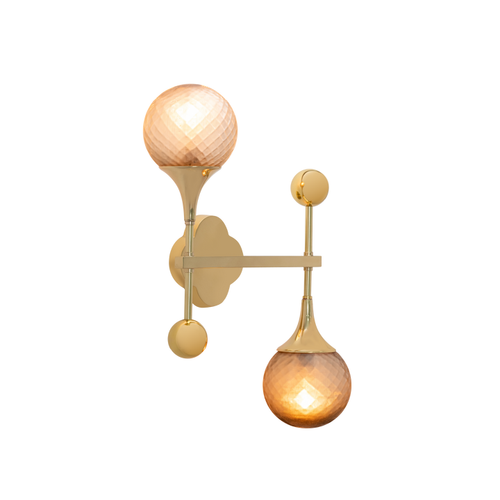 The orb wall lamp features a modern, sculptural design with two glass orbs set on a brass frame.
