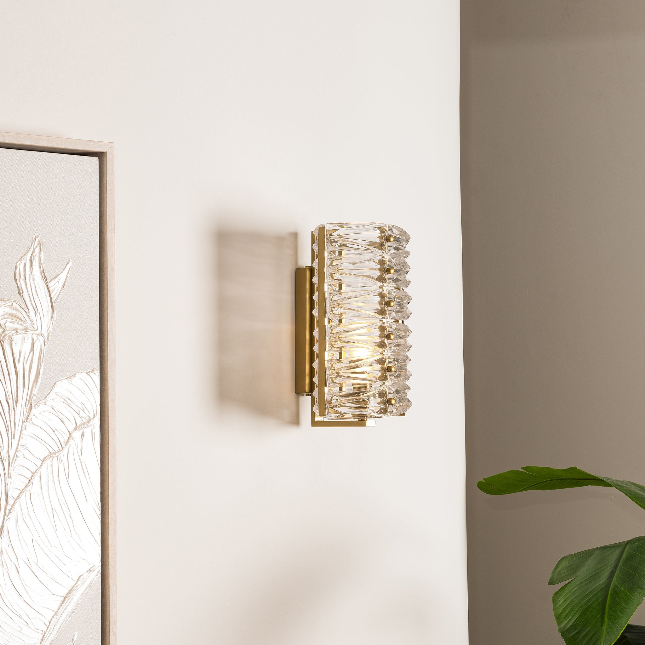 Complementing the orenos chandelier, this medium wall lamp showcases art deco elegance in a sleek vertical format.The glass shades are screwed into the frame, creating a balanced look.