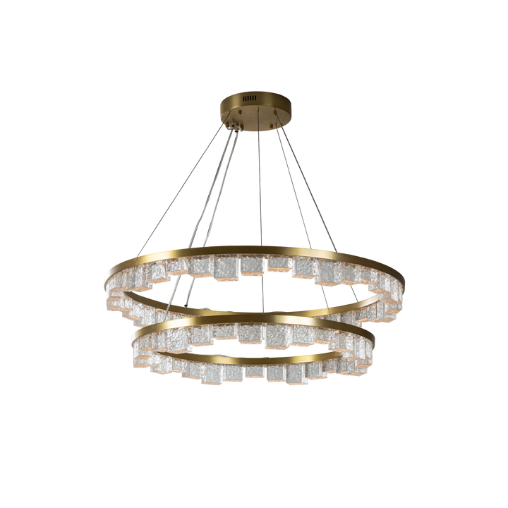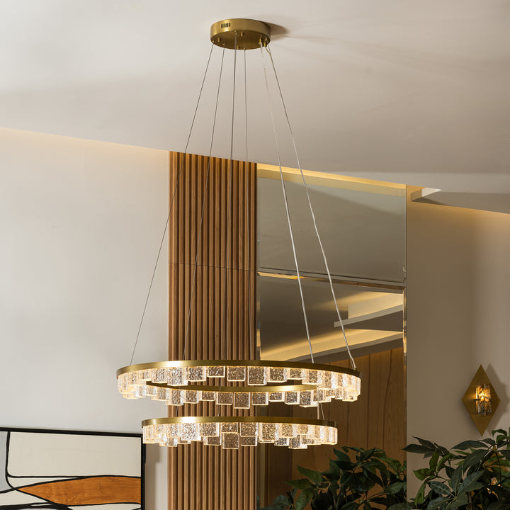 The art deco-inspired ring chandelier features a two-tier design that adds style and balance to any room. Thick textured glass pieces reflect light beautifully, enhancing the chandelier’s bright and elegant look.
