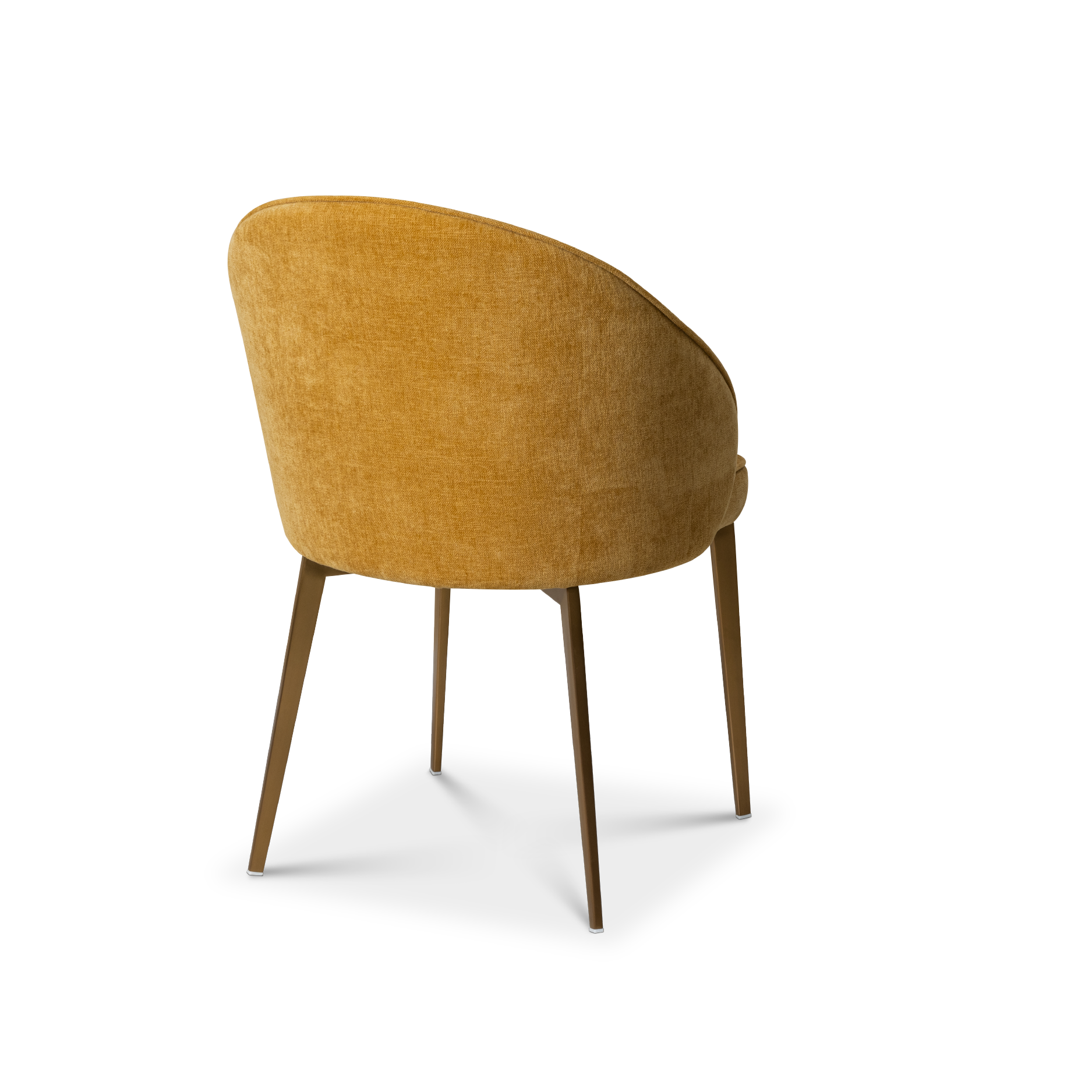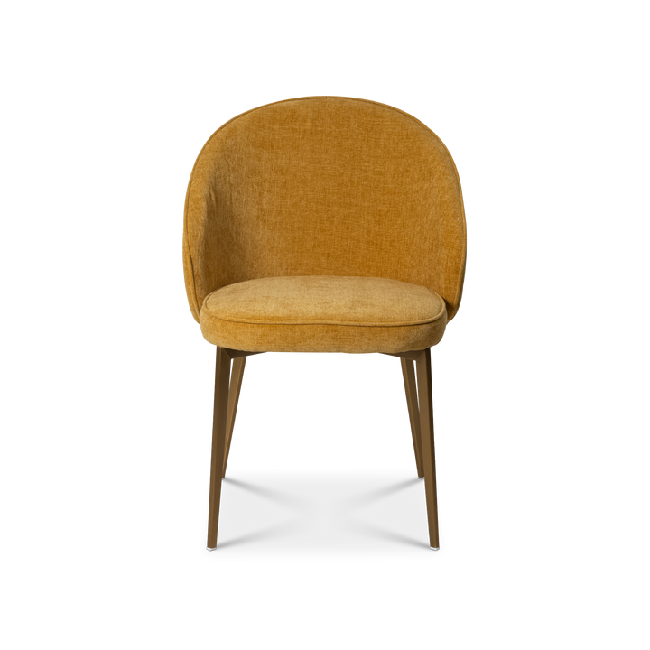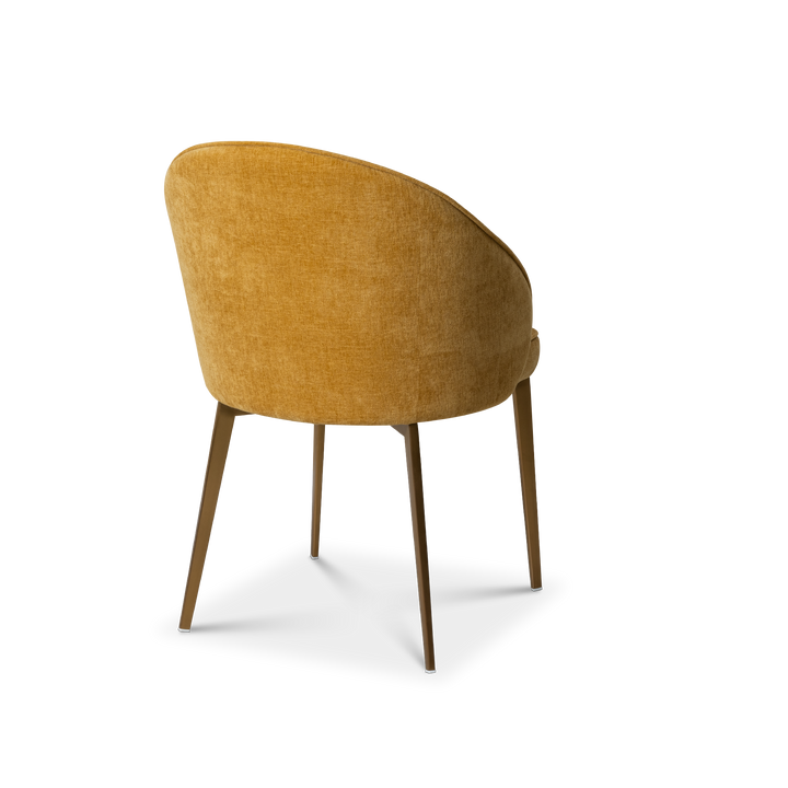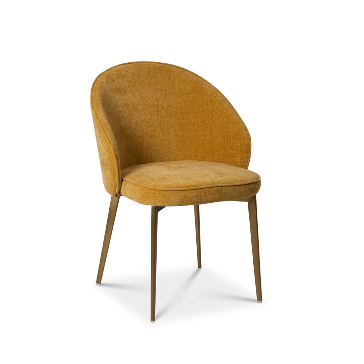 Upholstered in gaspar calendula fabric this dining chair exudes refined sophistication. Its stainless steel legs electroplated in brushed brass finish adds a glow bringing timeless elegance to your dining experience.
