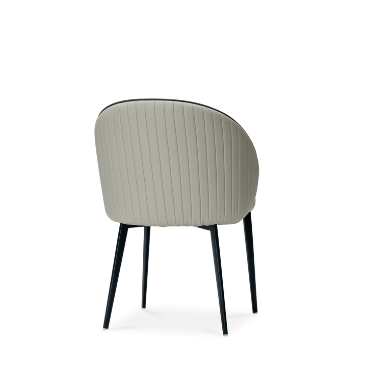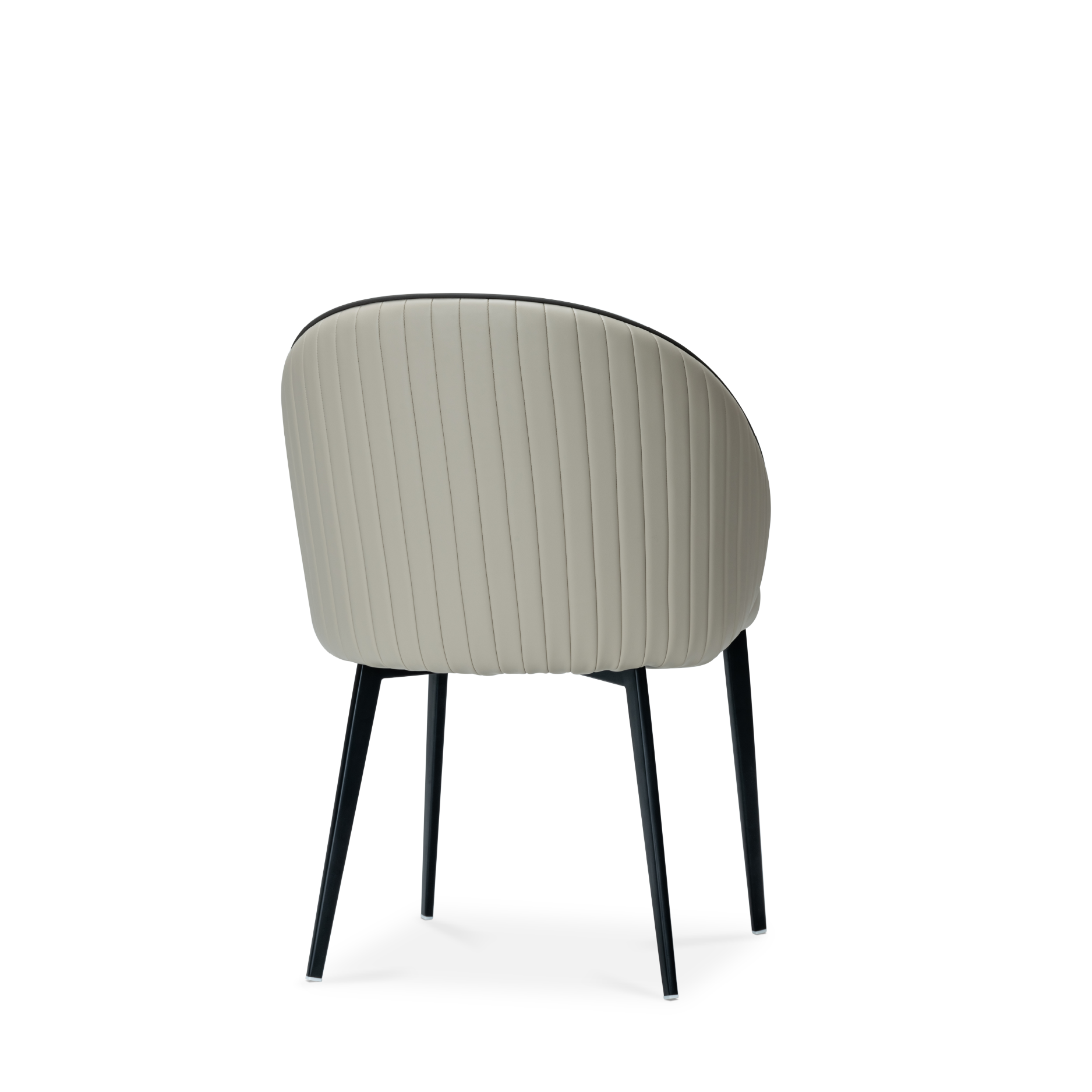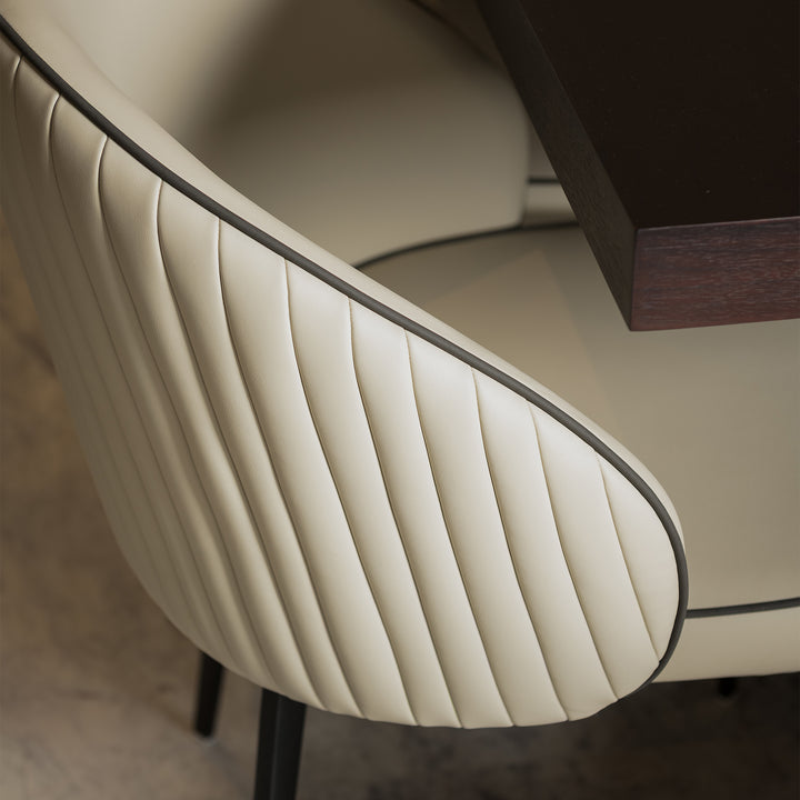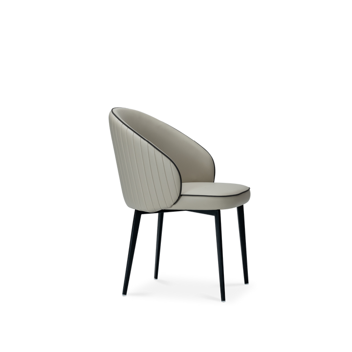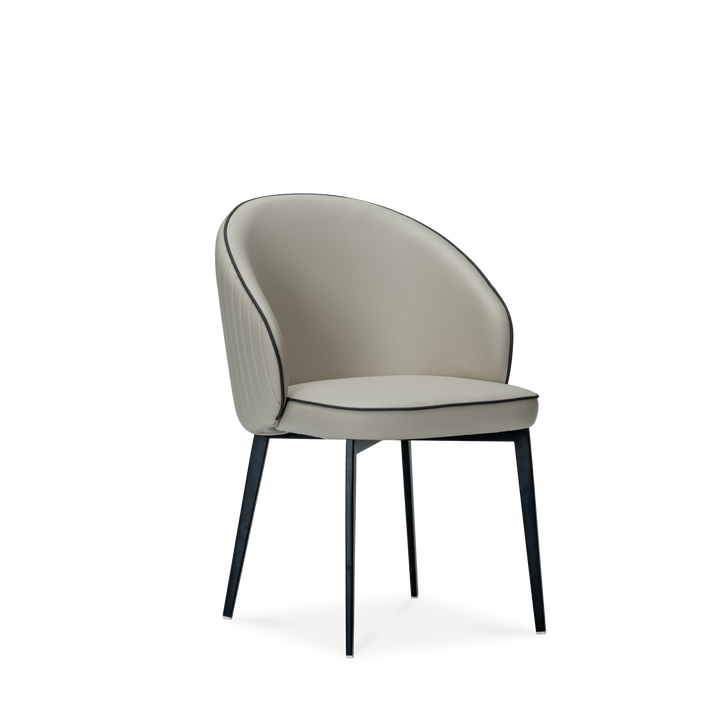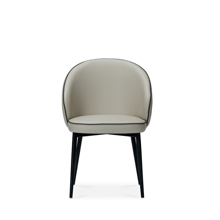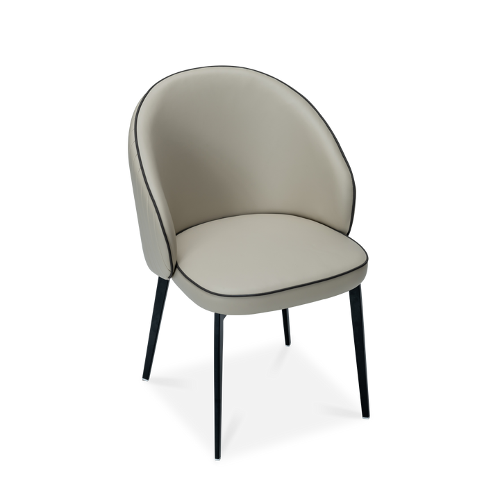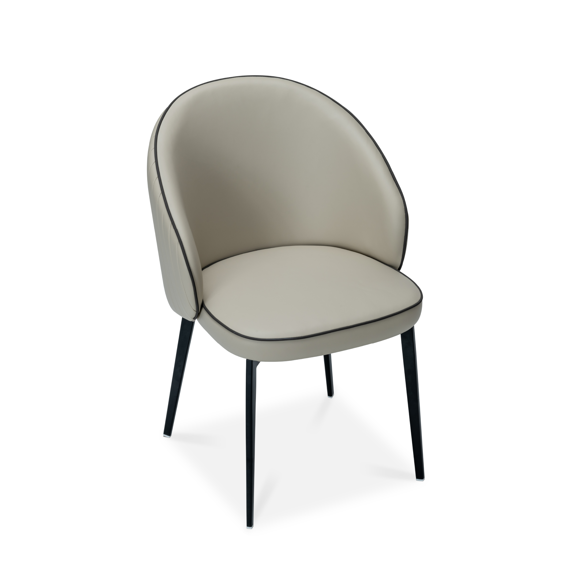 Elegant and refined, this chair embodies modern contemporary design with its sculpted form. Beige faux leather with black piping adds definition and contrast, while slim black steel legs complete its graceful silhouette.