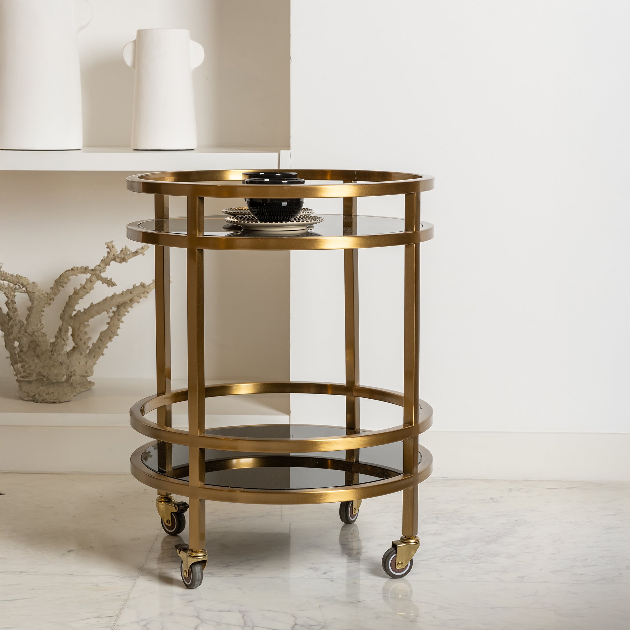 Inspired by art deco elegance, this bar cart features 8mm black glass shelves set within a brushed brass-finished stainless steel frame. The circular silhouette and sculptural geometry create a striking sense of balance and sophistication.