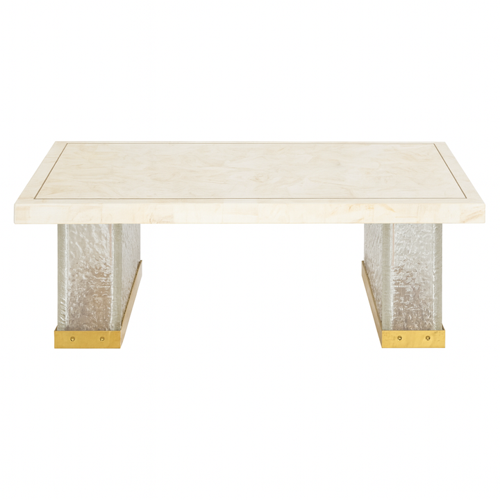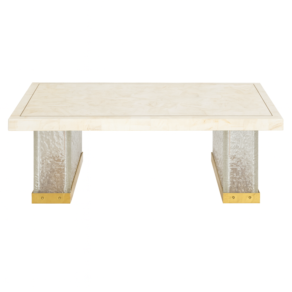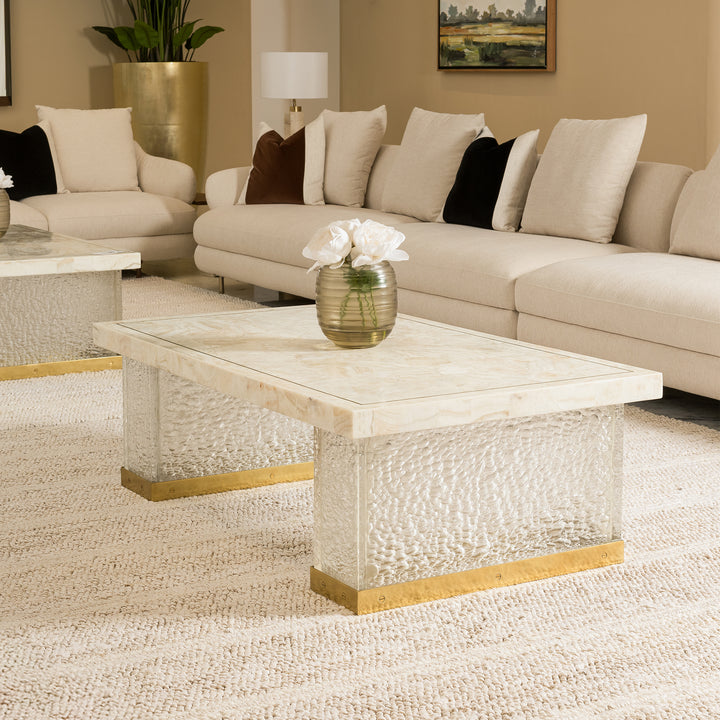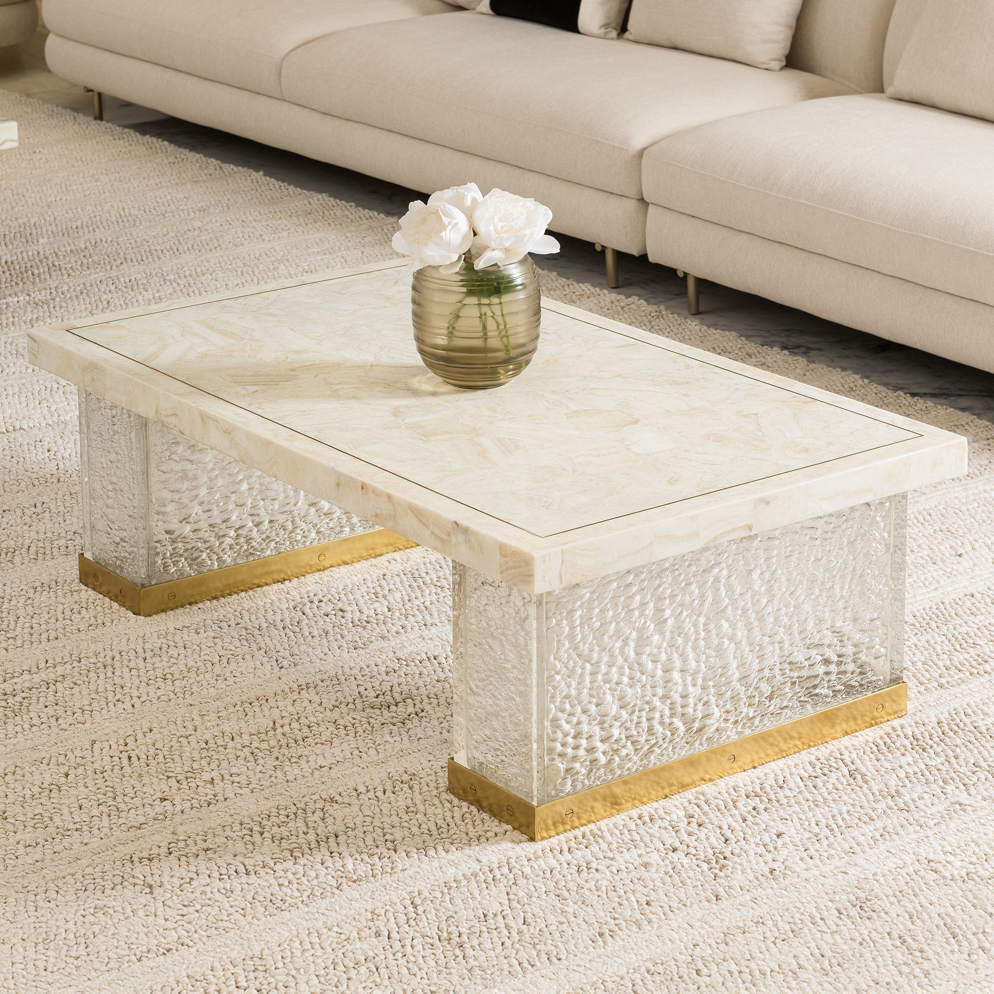 Modern classic with art deco influence, this coffee table is crowned with a polished crystal stone top enriched by delicate brass inlay. Its hand-carved acrylic legs, accented in antique brass, introduce sculptural elegance and luminous texture.