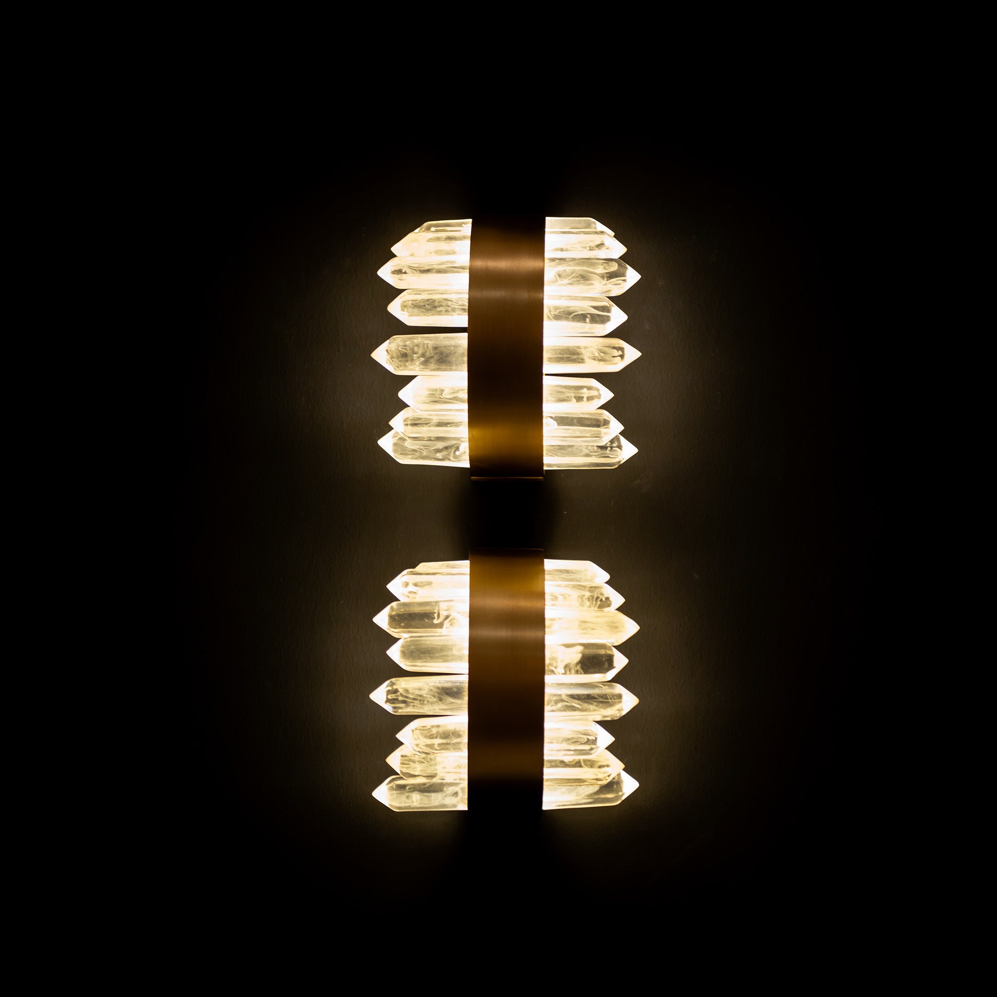 This wall lamp features clear resin spikes that resemble crystal formations. A sleek antique brass band encircles the center, creating a bold contrast and refined structure.